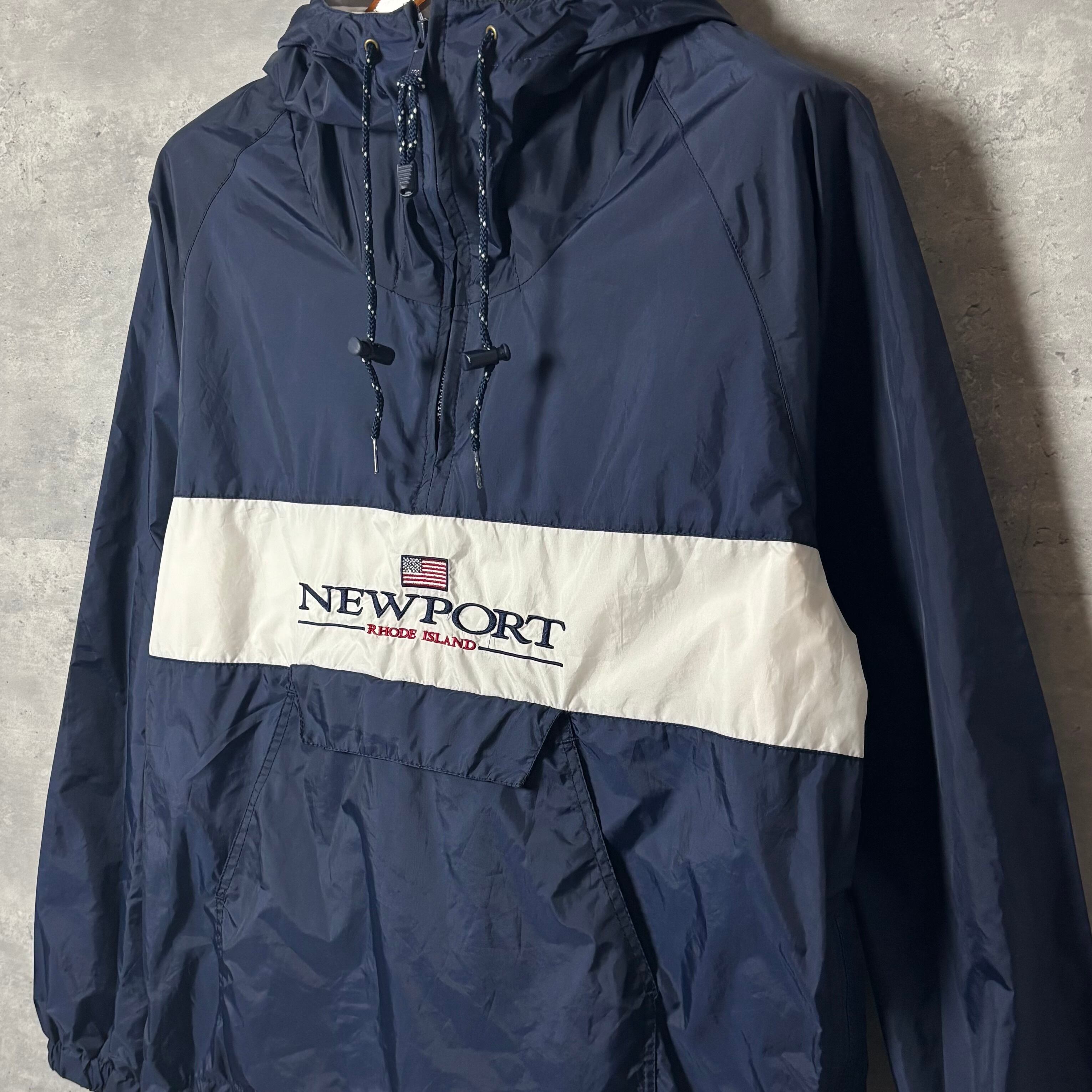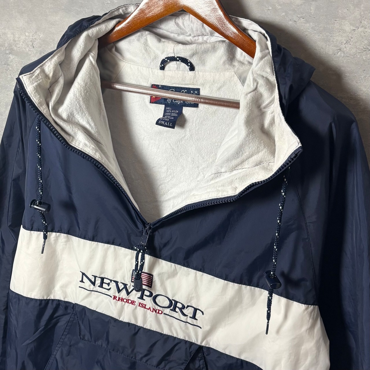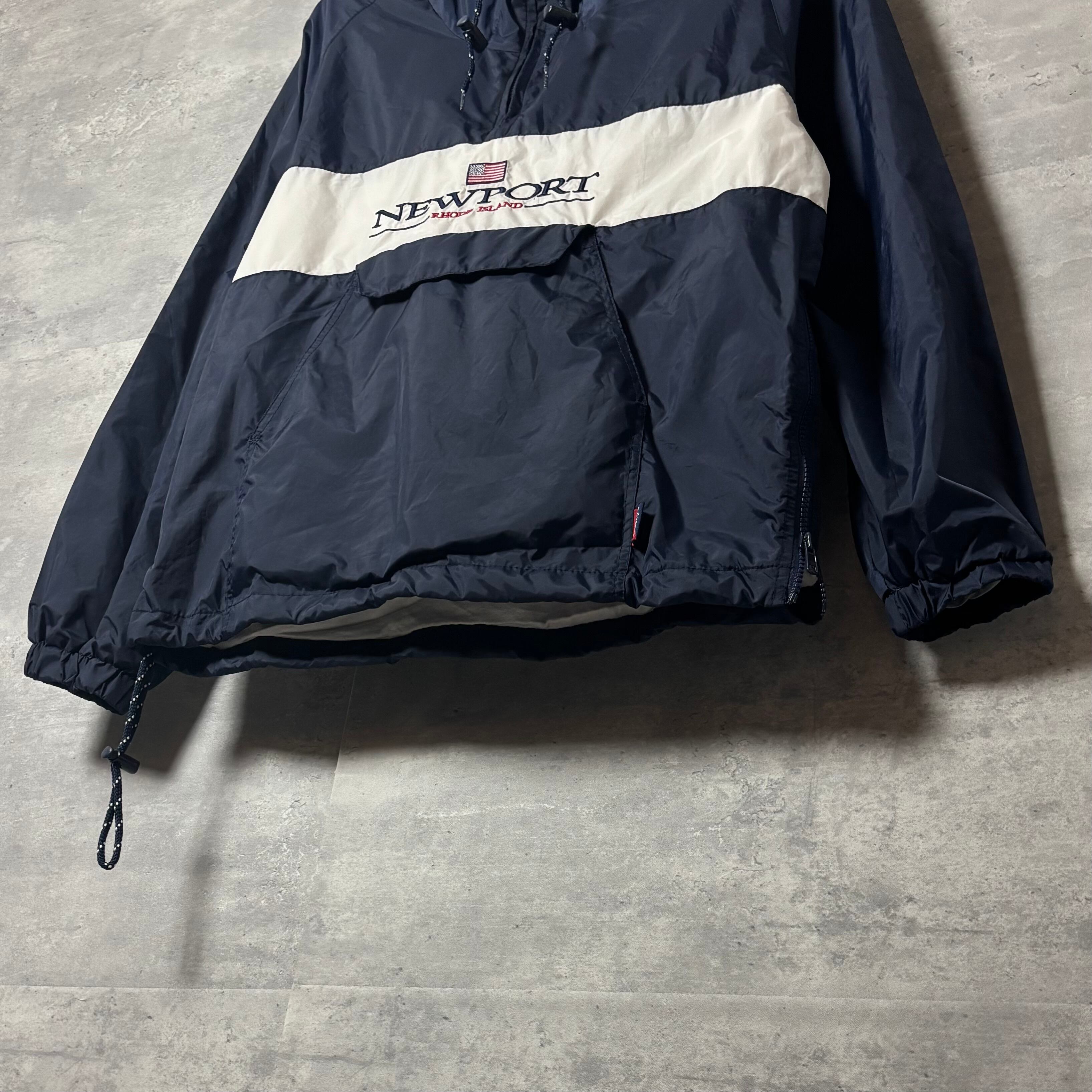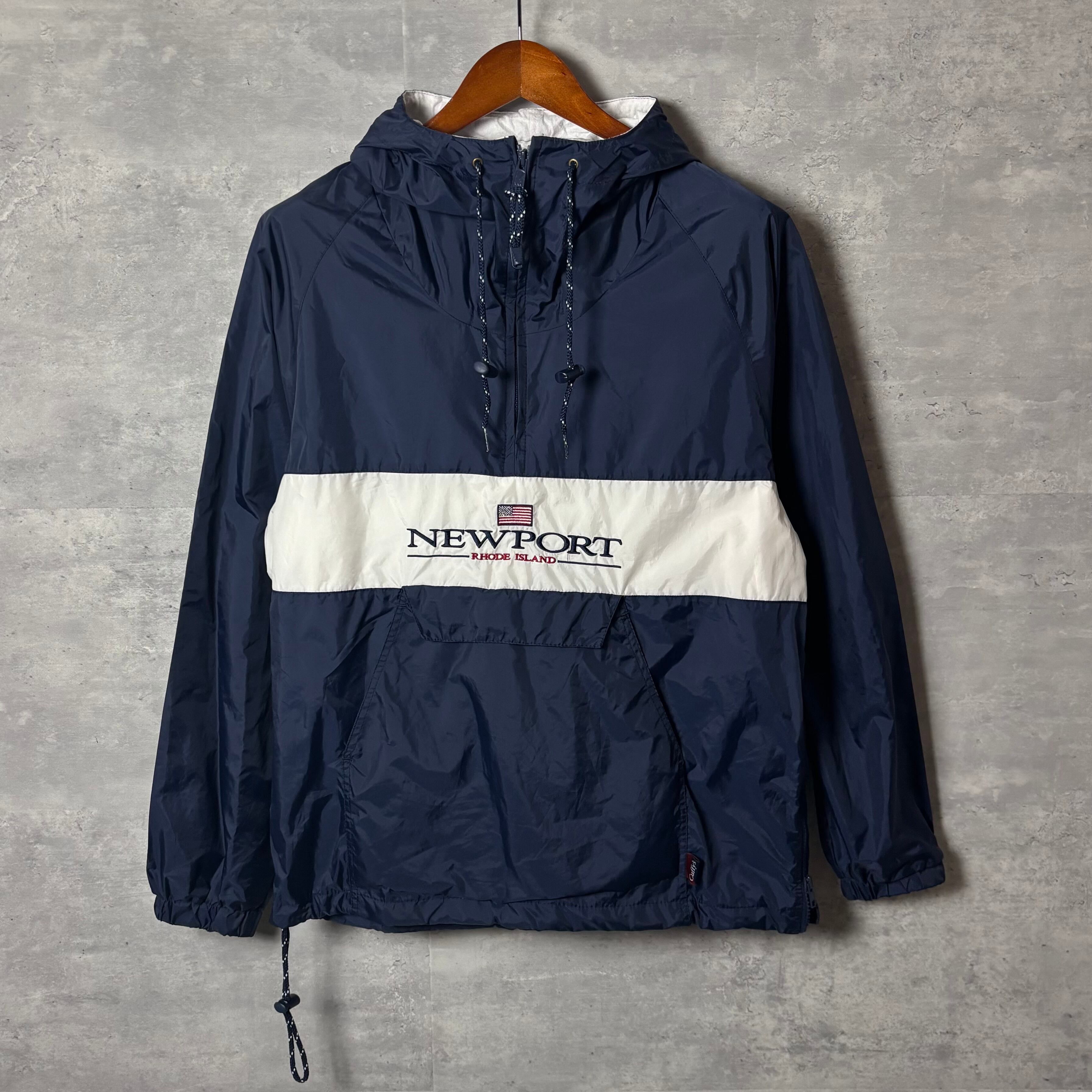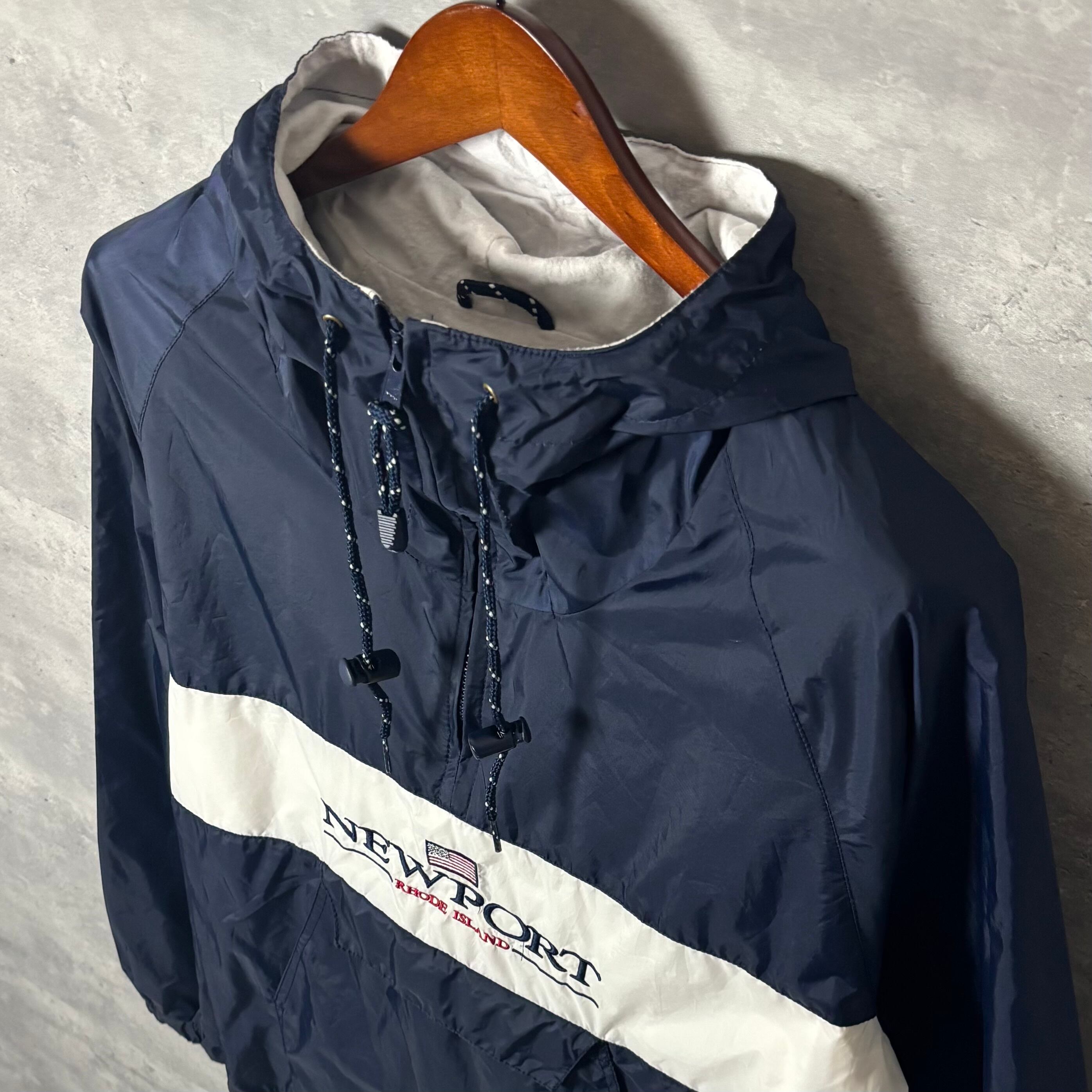 - 【特徴】: 90sらしい太めの配色切り替え、NEWPORT RHODE ISLAND刺繍ロゴ、裏地パイル仕様、ドローコード付き、ハーフジップ