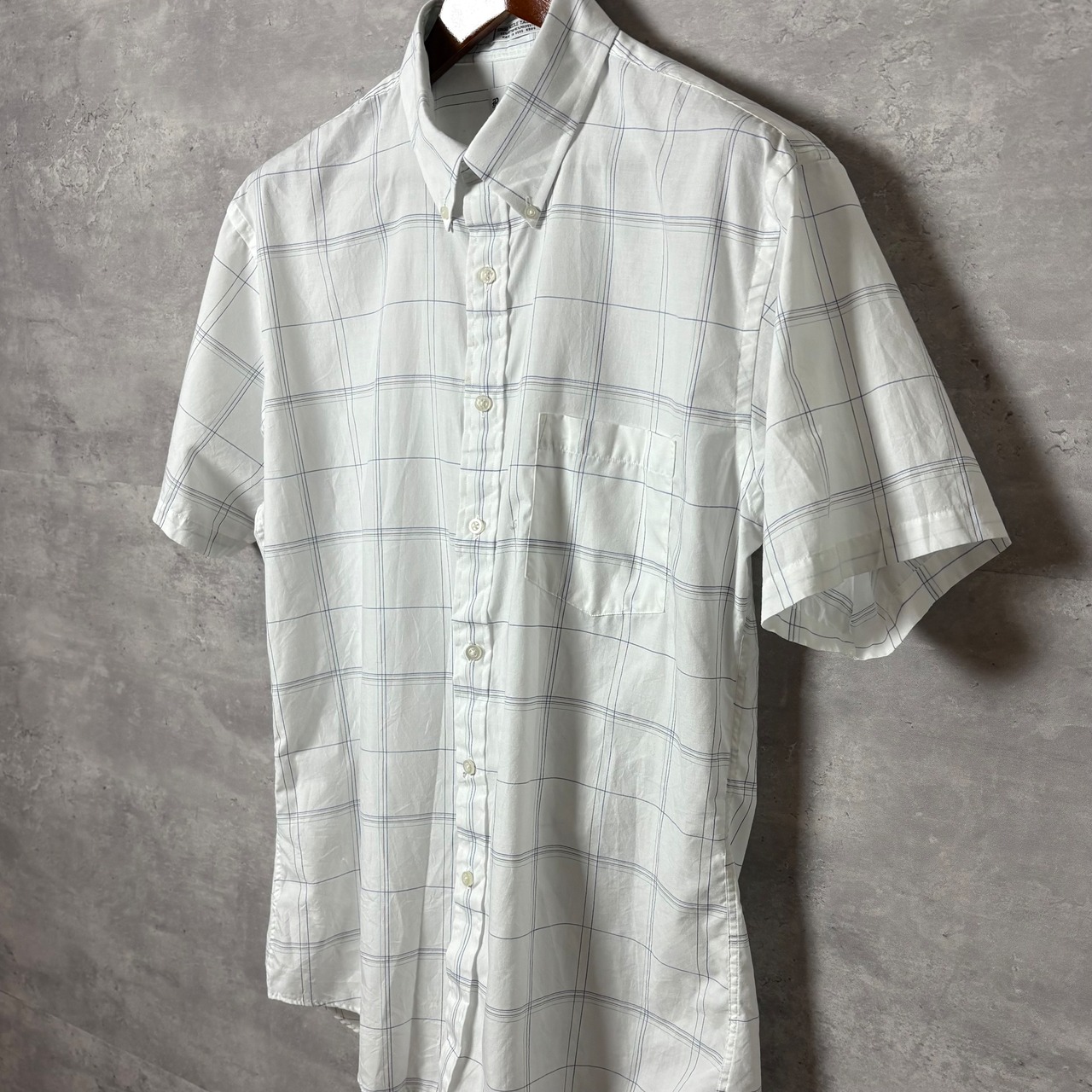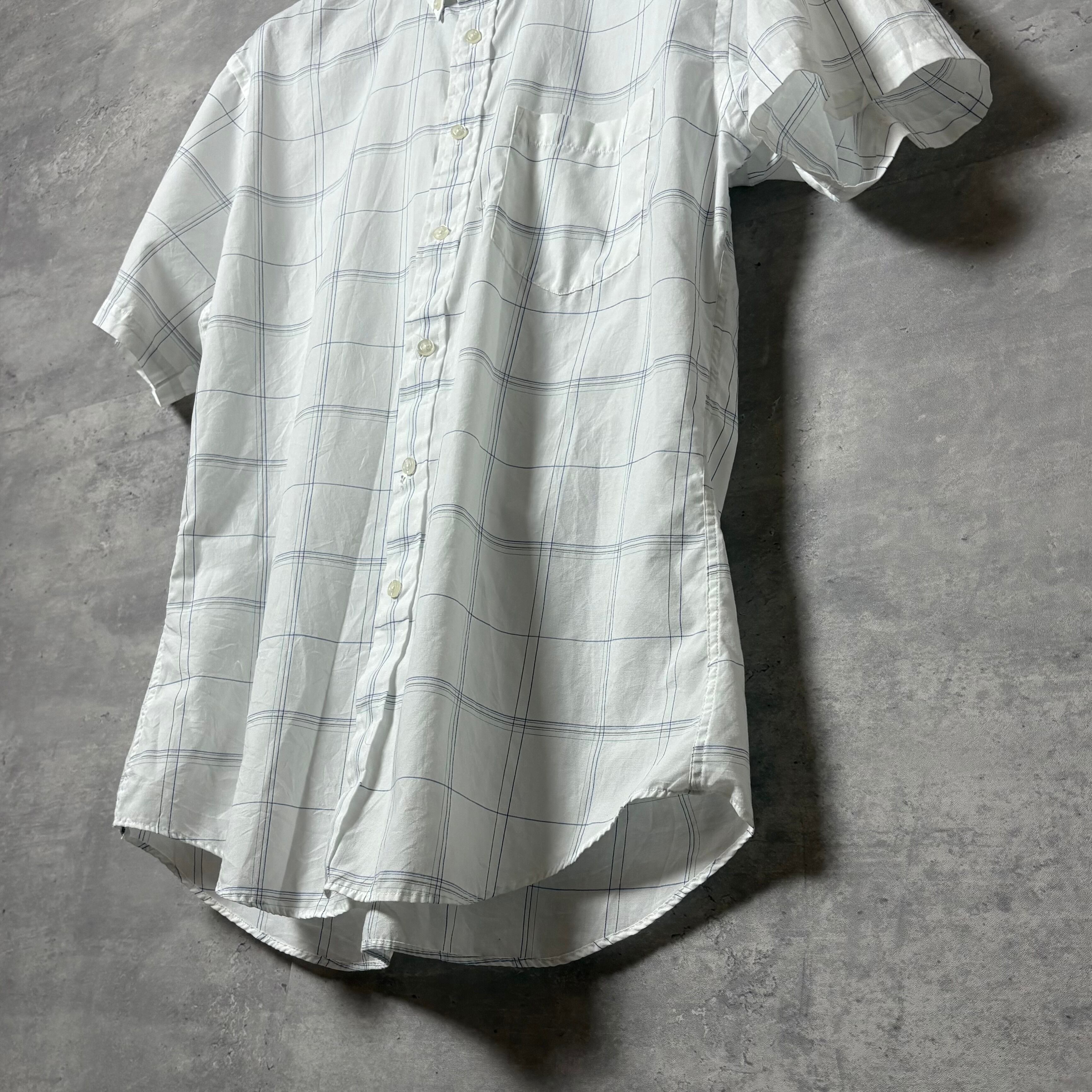 90年代香港製のヴィンテージ半袖シャツ。クラシカルなチェック柄とボタンダウン仕様で、ビジネスカジュアルにも使える万能デザイン。ジャストサイズで着ても、ゆるく羽織っても様になります。シングルニードル縫製で仕立ての良さも感じられる一枚です。