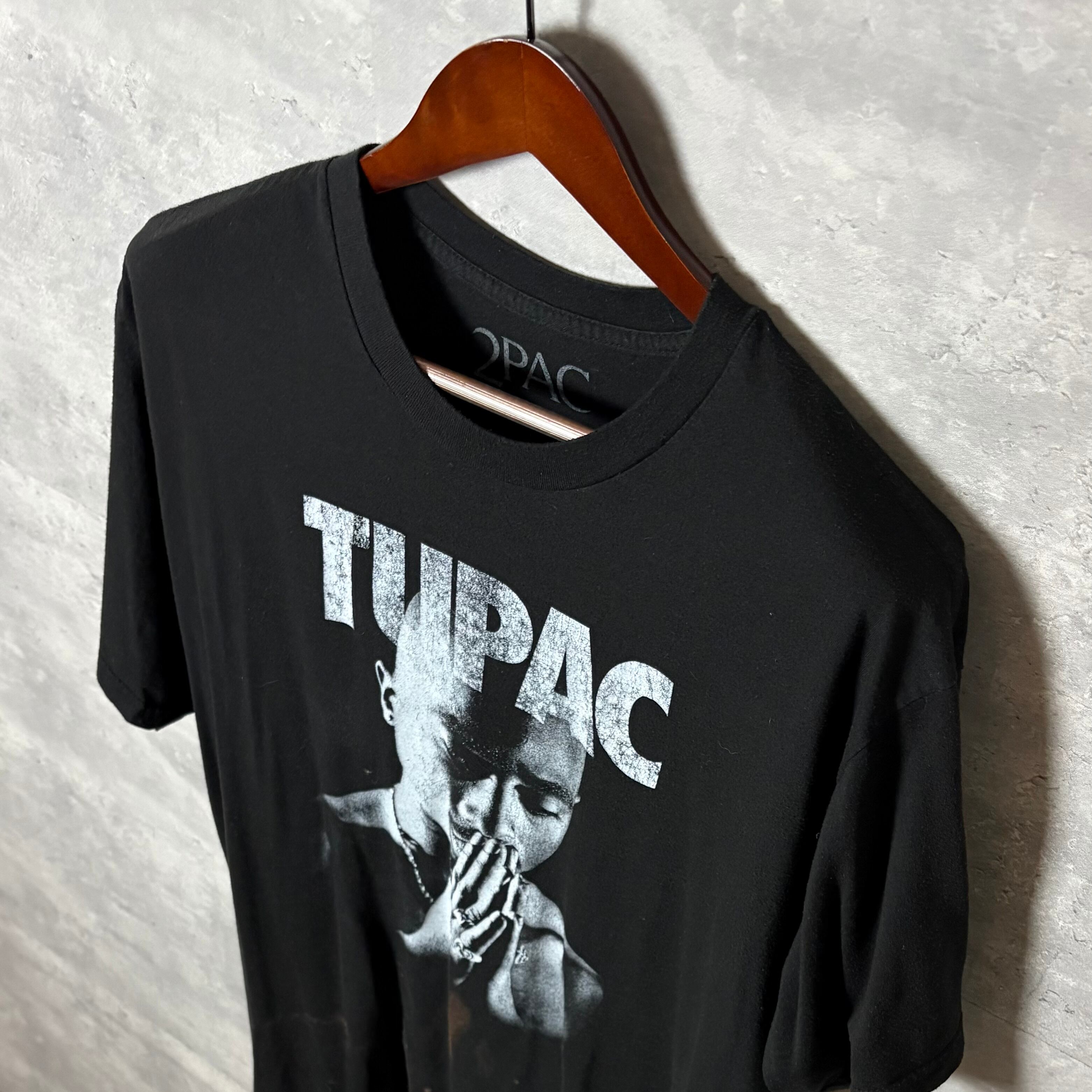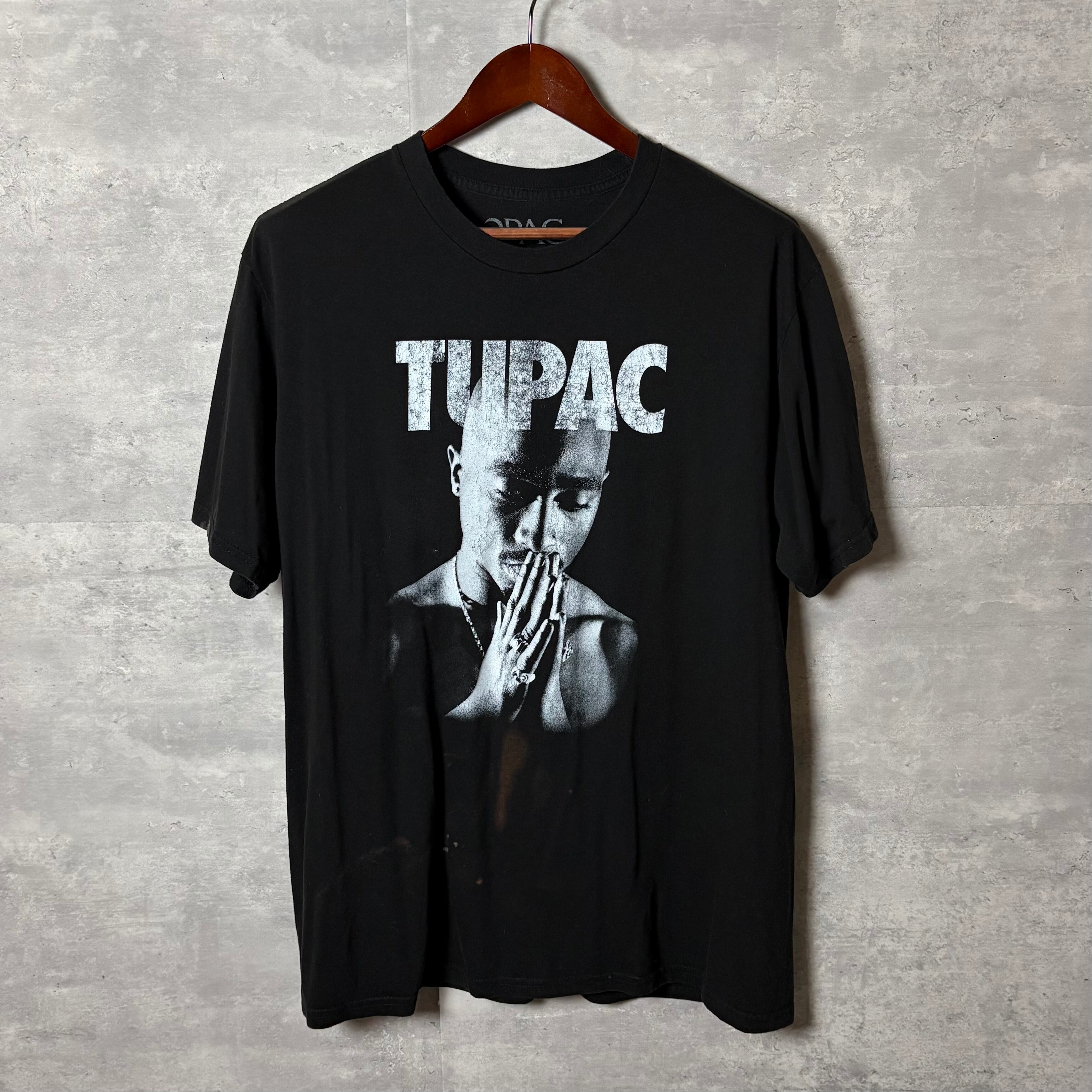 - 【特徴】: フロントにTUPACの祈る姿を大胆にプリントした一枚。Bravado社による公式ライセンス品で、メキシコ製。コットン50%×ポリエステル50%の混紡生地で柔らかく着やすい。背面は無地。