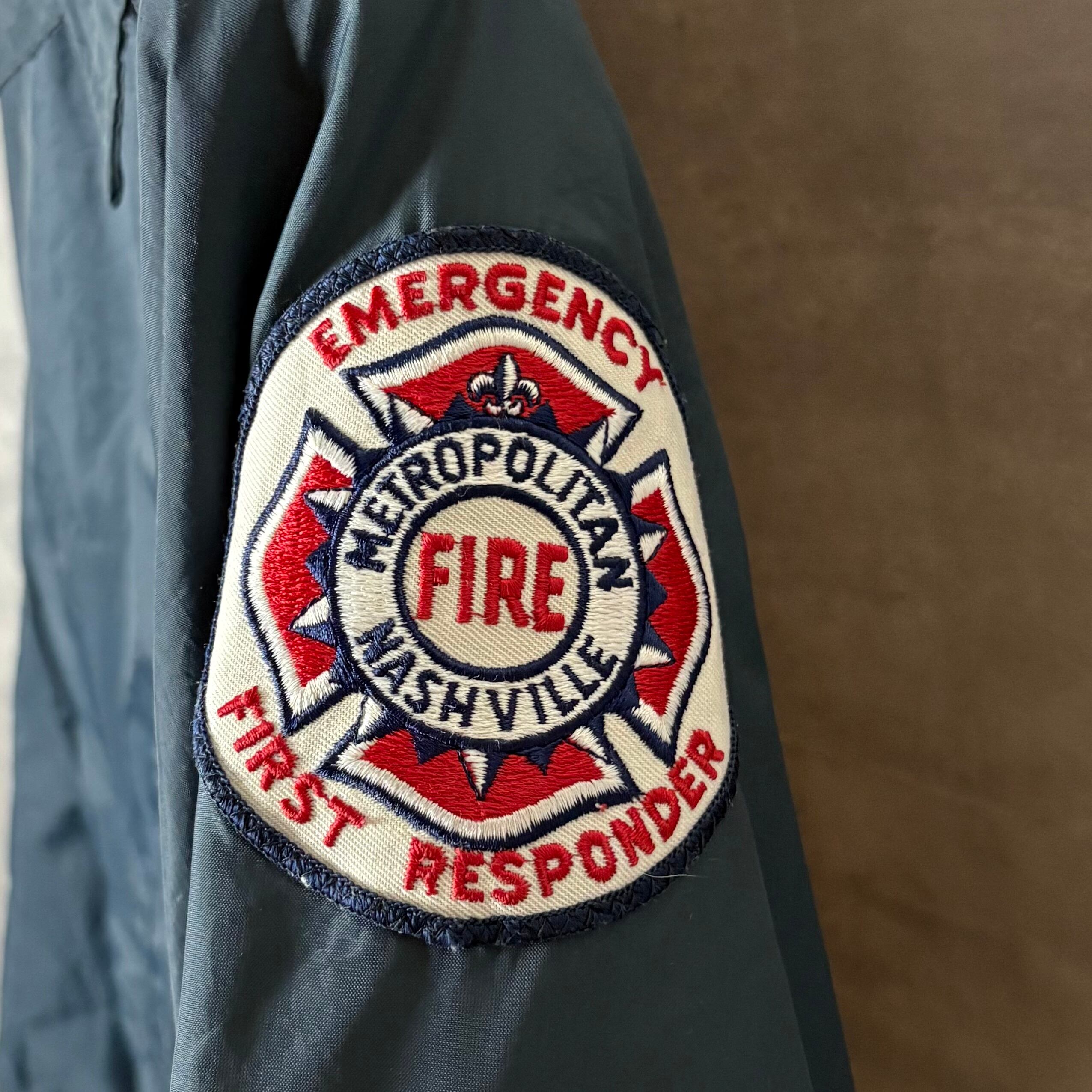 アメリカ・テネシー州ナッシュビルの消防局ファーストレスポンダー用公式ジャケット。防風性のあるナイロンシェルと、厚手の裏地が特徴です。ミリタリーやレスキューテイストのアウターとして人気が高く、古着好きにも支持されるアイテム。オーバーサイズで羽織っても◎。希少な一点物です。
