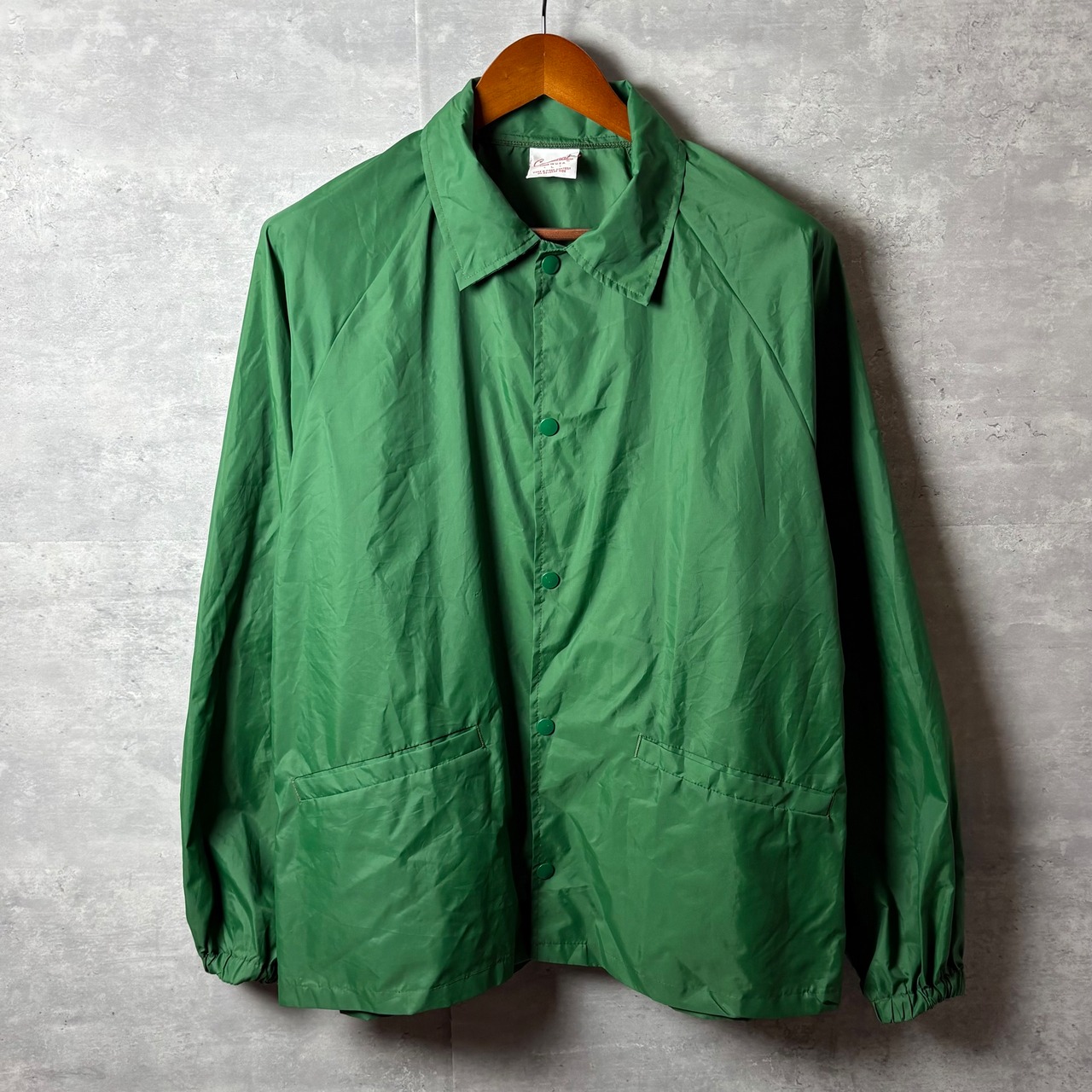 アメリカ製Cardinalの80年代ヴィンテージコーチジャケットです。無地のグリーンカラーで使いやすく、オーバーサイズシルエットでゆったり羽織れます。タグはLサイズですが、実寸ではXL相当の大きめサイズ感です。ストリートや古着コーデの差し色におすすめです。