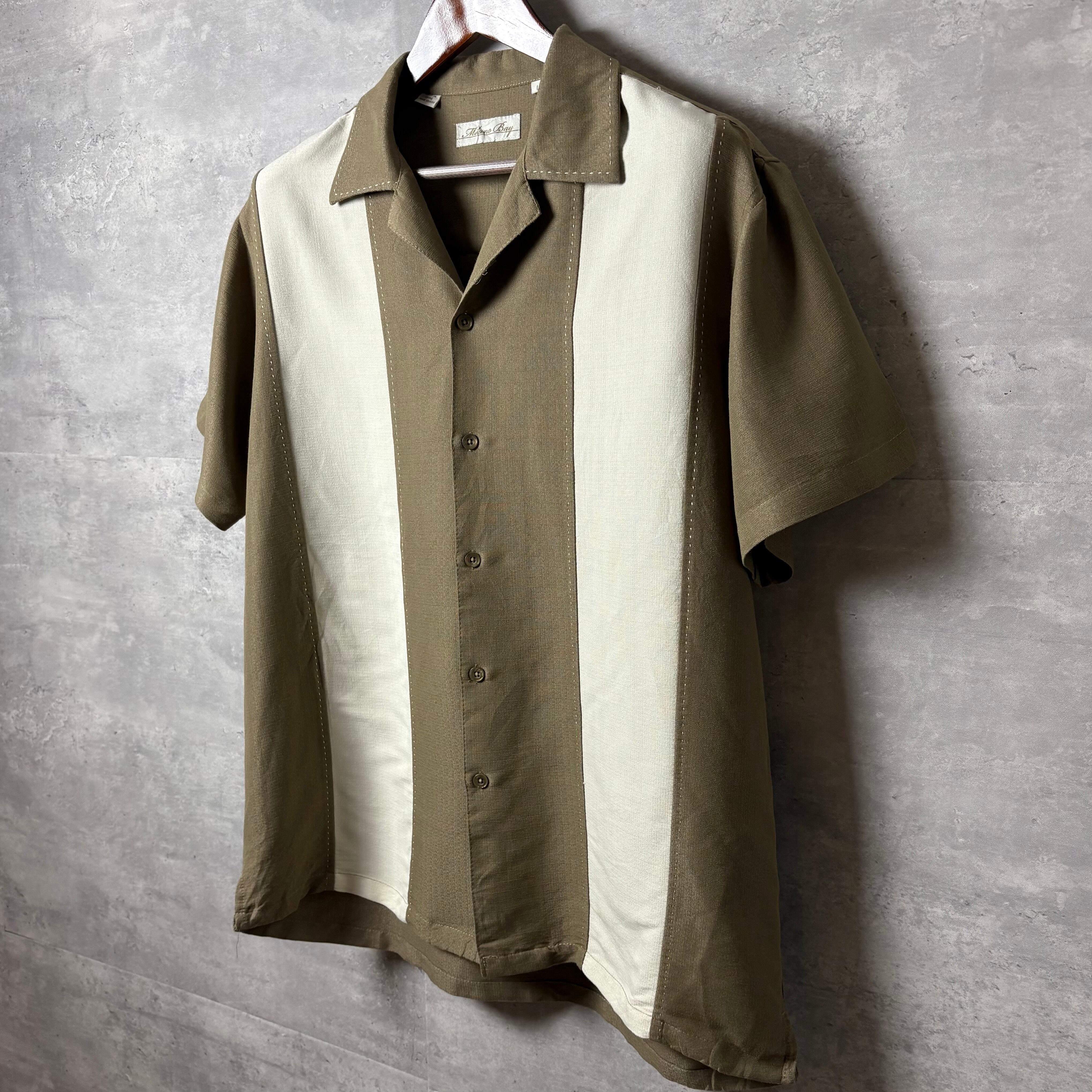 上品な光沢と落ち感のあるレーヨン混素材に、ベージュ×アイボリーの柔らかな切替デザインが映える1枚。トレンドの開襟シャツスタイルで、1枚でサマになる抜け感のある古着ミックスコーデにおすすめ。ワイドパンツやスラックスとの相性も抜群です。