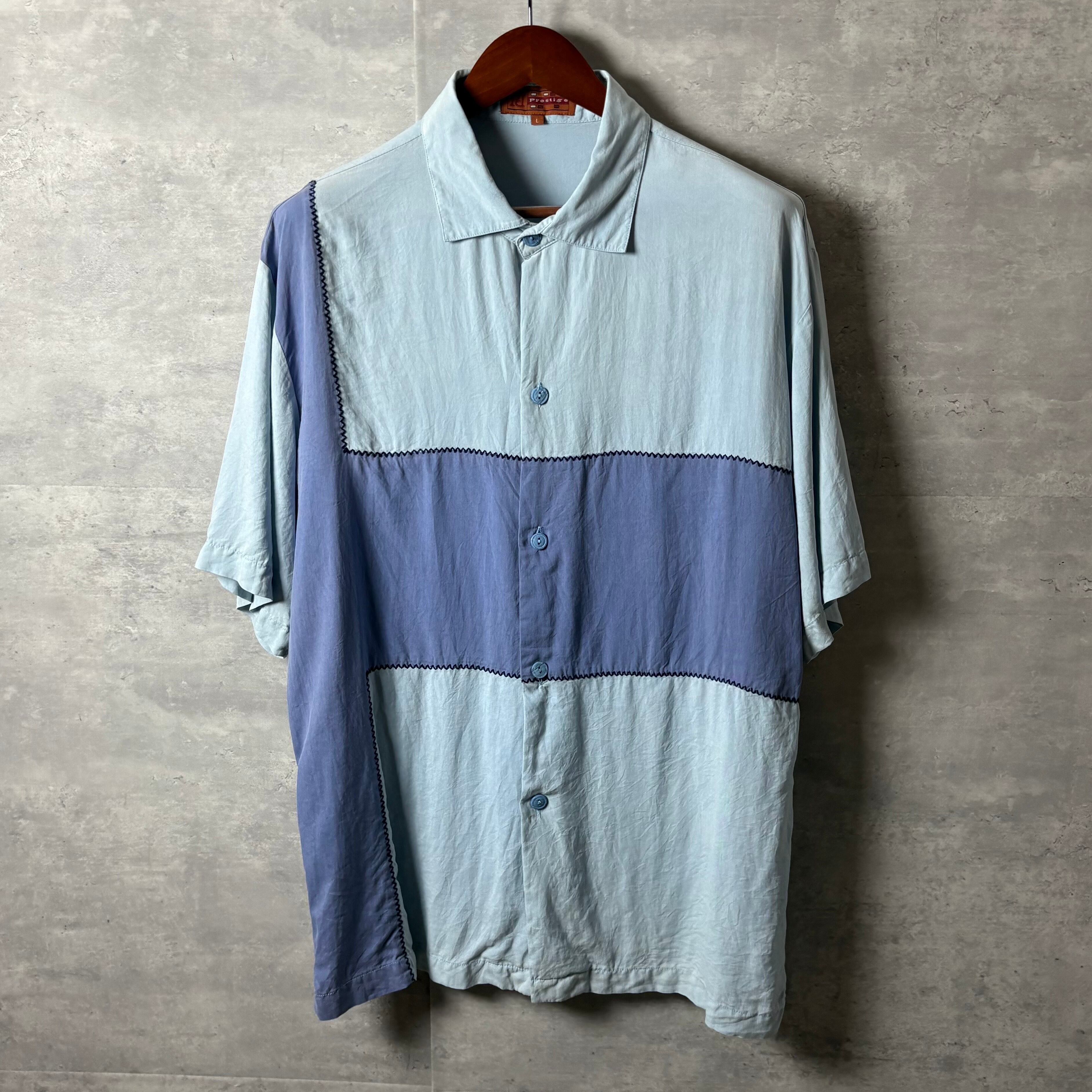 Prestige オープンカラー シャツ シルク100% 切替デザイン L 水色