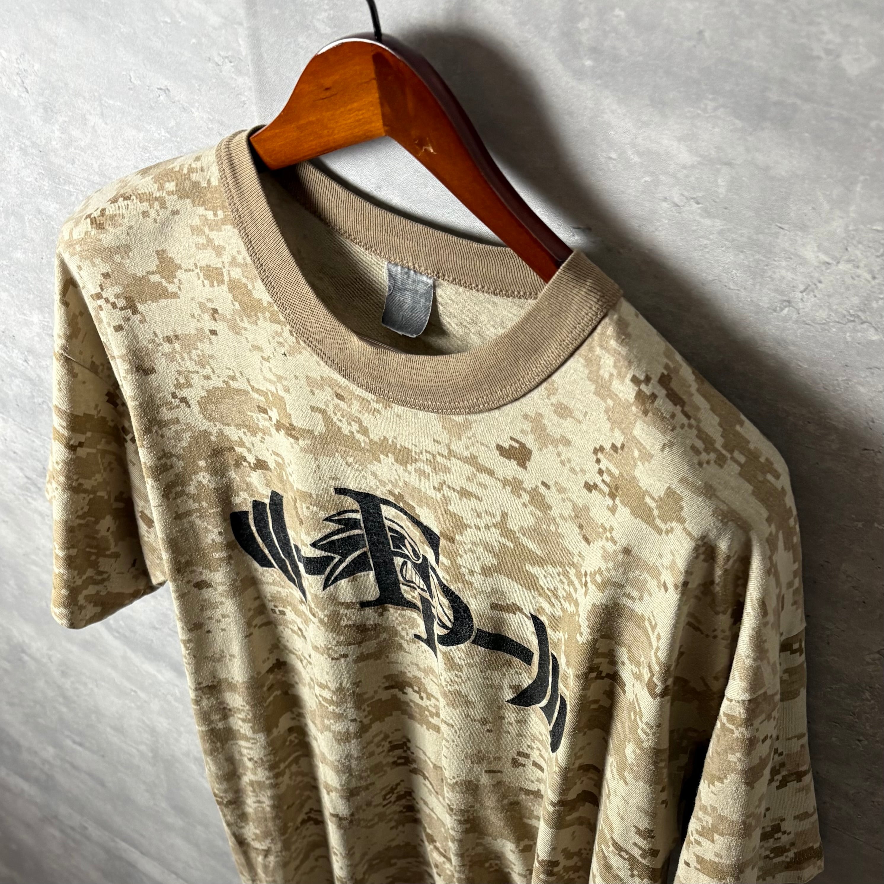 90年代以前のヴィンテージ品として買い付けた、デザートデジタルカモ柄の半袖Tシャツです。ブランドタグは判読不能ですが、仕入れの経緯から古い年代のアイテムと判断しています。フロントには「スカルや動物の頭部」とバーベルを組み合わせた、力強いグラフィックがプリントされており、ストリートやミリタリー、トレーニングスタイルにぴったりです。全体的に着用感があり、特に小穴が複数箇所に見られますが、それが古着ならではの味やリアルな雰囲気を醸し出しています。ダメージ感を活かした着こなしや、レイヤードスタイルにおすすめです。