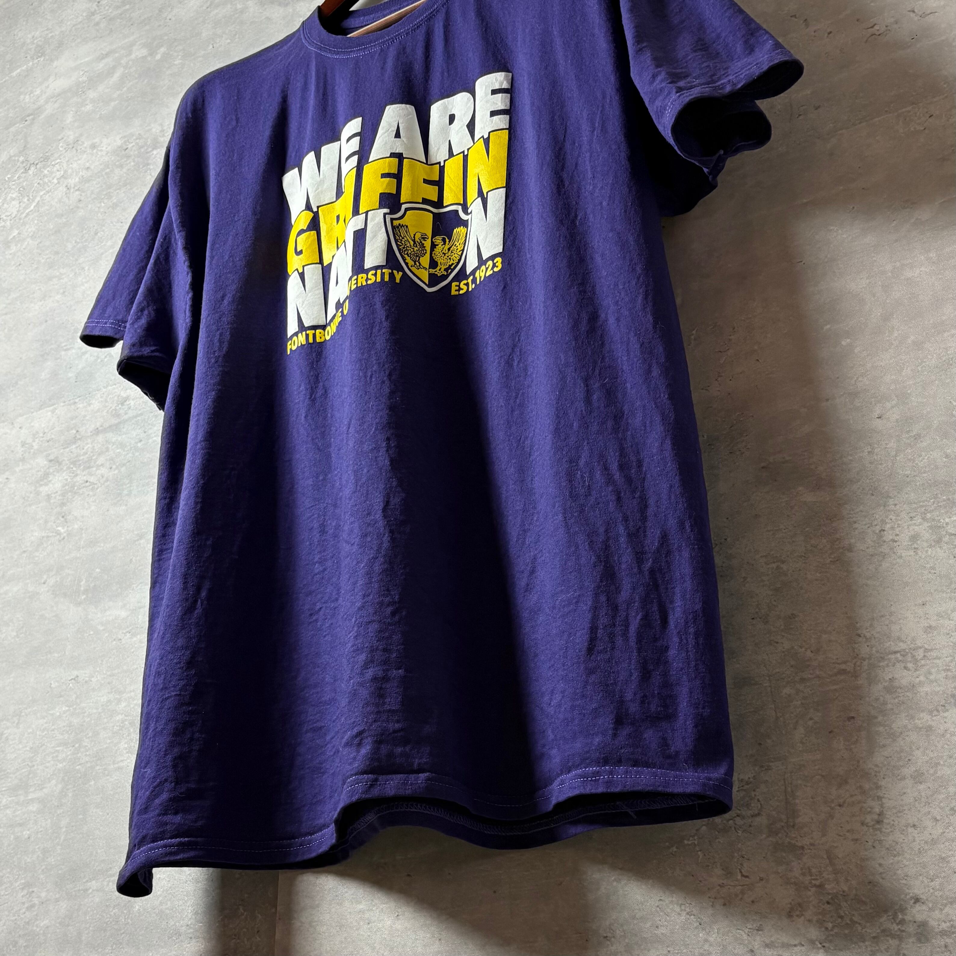 Champion製の定番カレッジTシャツ。落ち着いたパープルカラーにイエローのプリントが映える一枚です。アメリカの私立大学「FONTBONNE UNIVERSITY」のロゴ入りで、古着らしい雰囲気も抜群。ワイドなシルエットでゆったり着られるため、ユニセックスでの着用もおすすめ。シンプルなデニムやカーゴパンツと合わせても◎