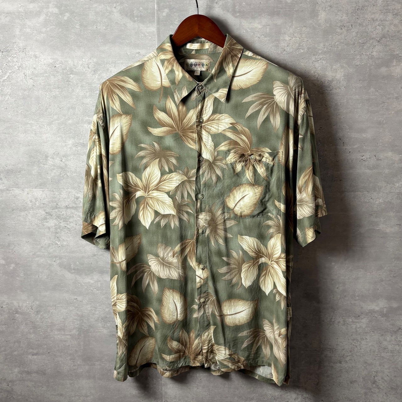 90s CAMPIA MODAの韓国製アロハシャツ。肌触りの良いレーヨン素材に、トロピカルながら落ち着きある大人なリーフ柄が魅力の一着。ゆったりとしたシルエットで風通しもよく、夏の古着コーデに最適です。ショーツやリネンパンツと合わせてリゾート感を楽しんでも◎