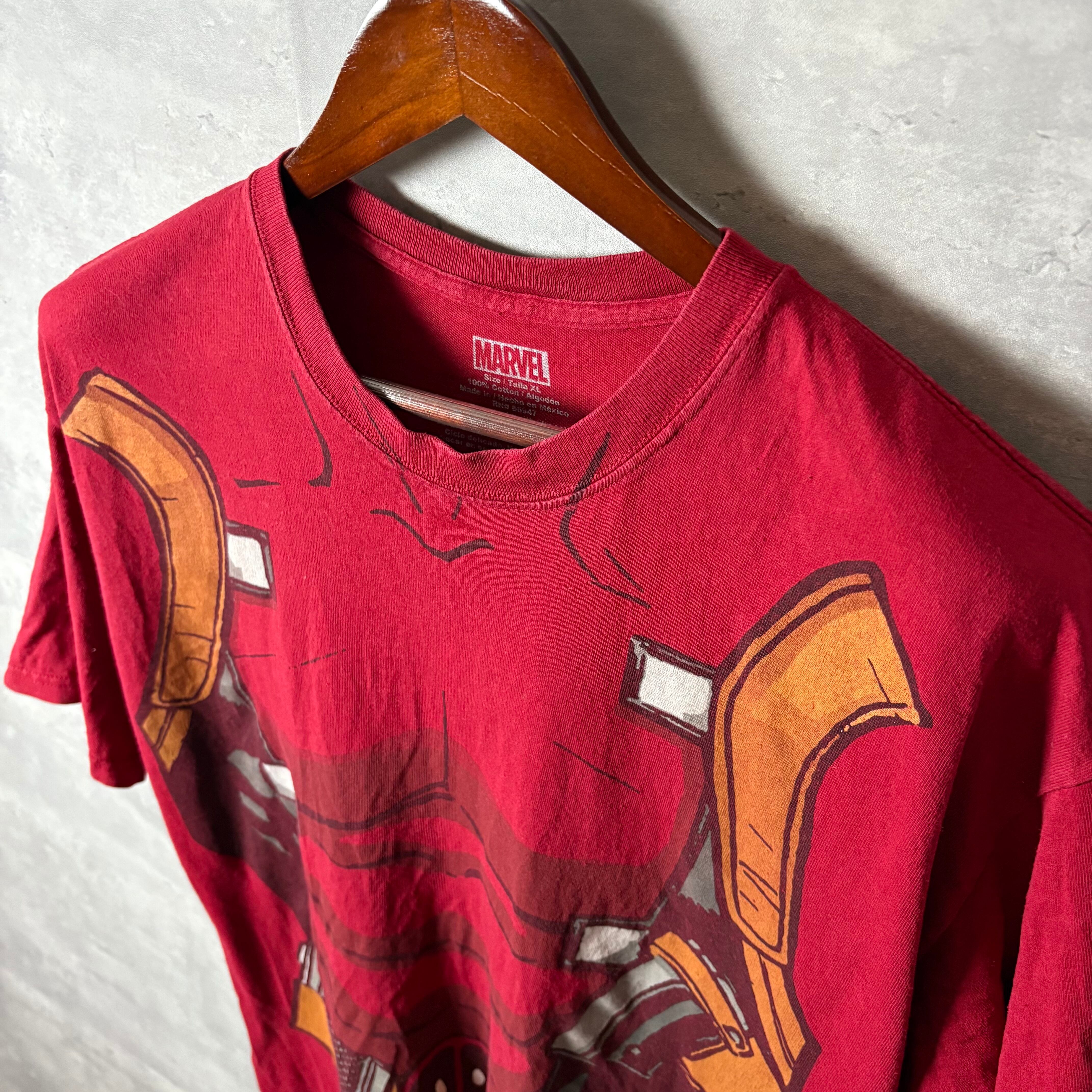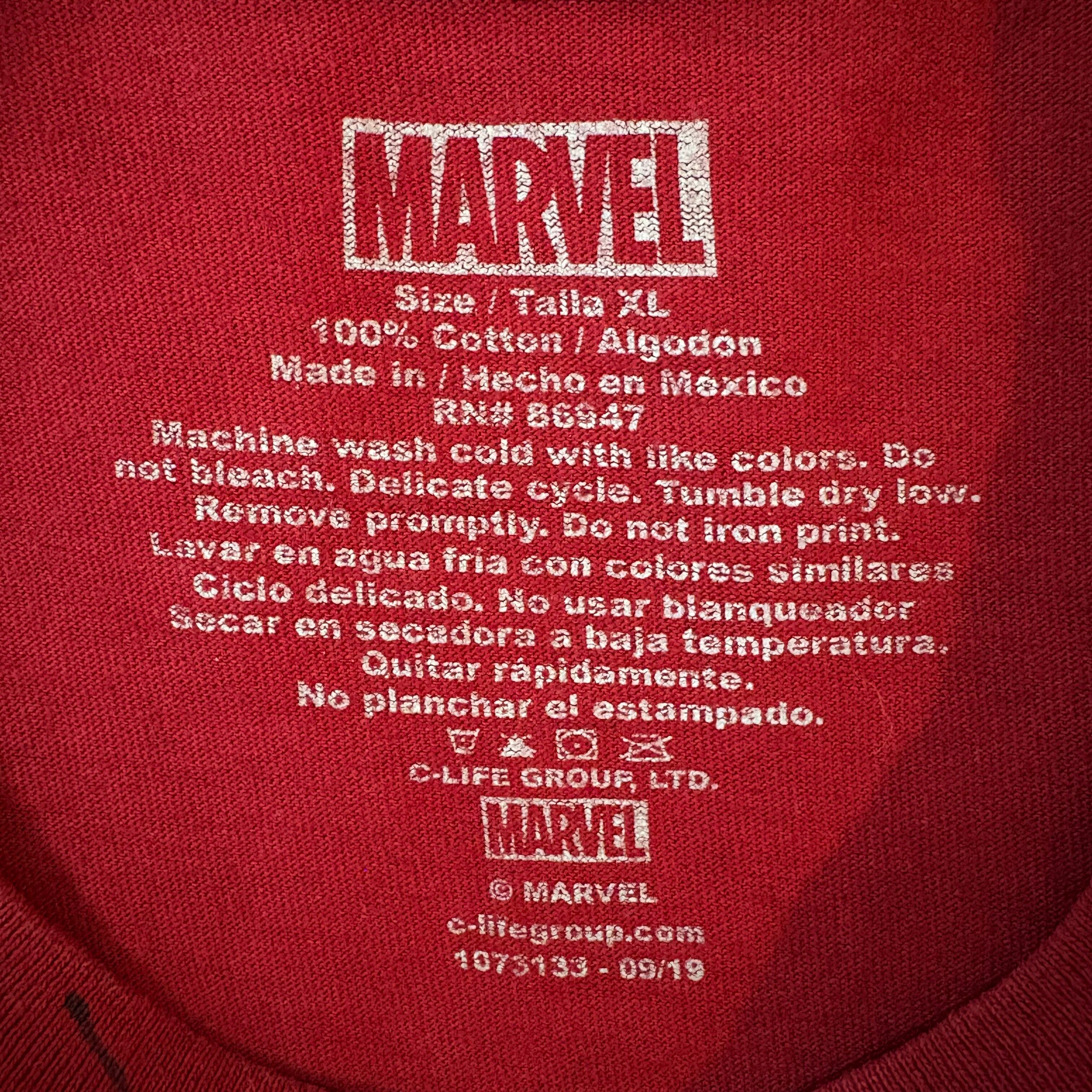 - 【特徴】: デッドプールのボディを模した前面ビッグプリント、色褪せとプリントのクラックあり、首元プリントタグ