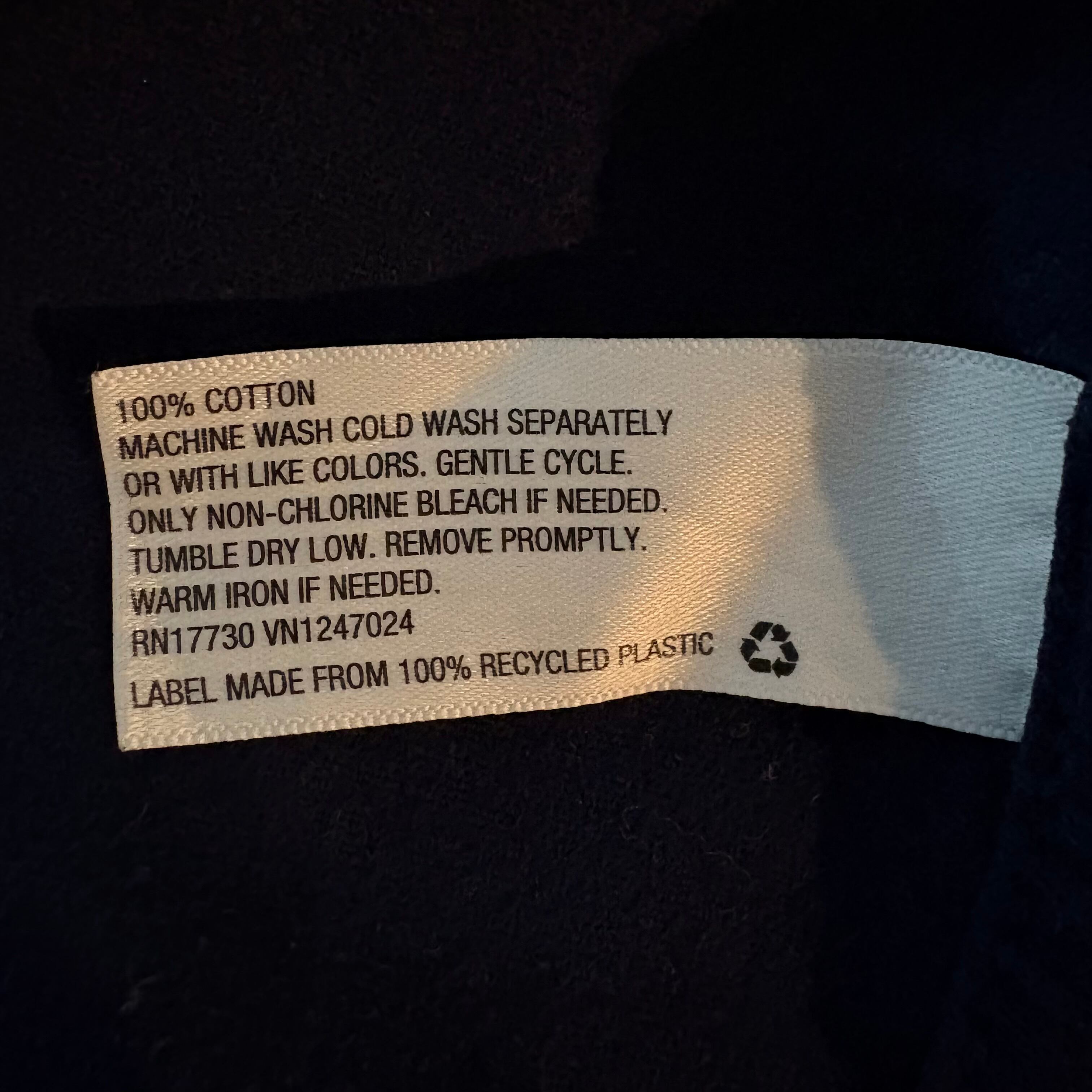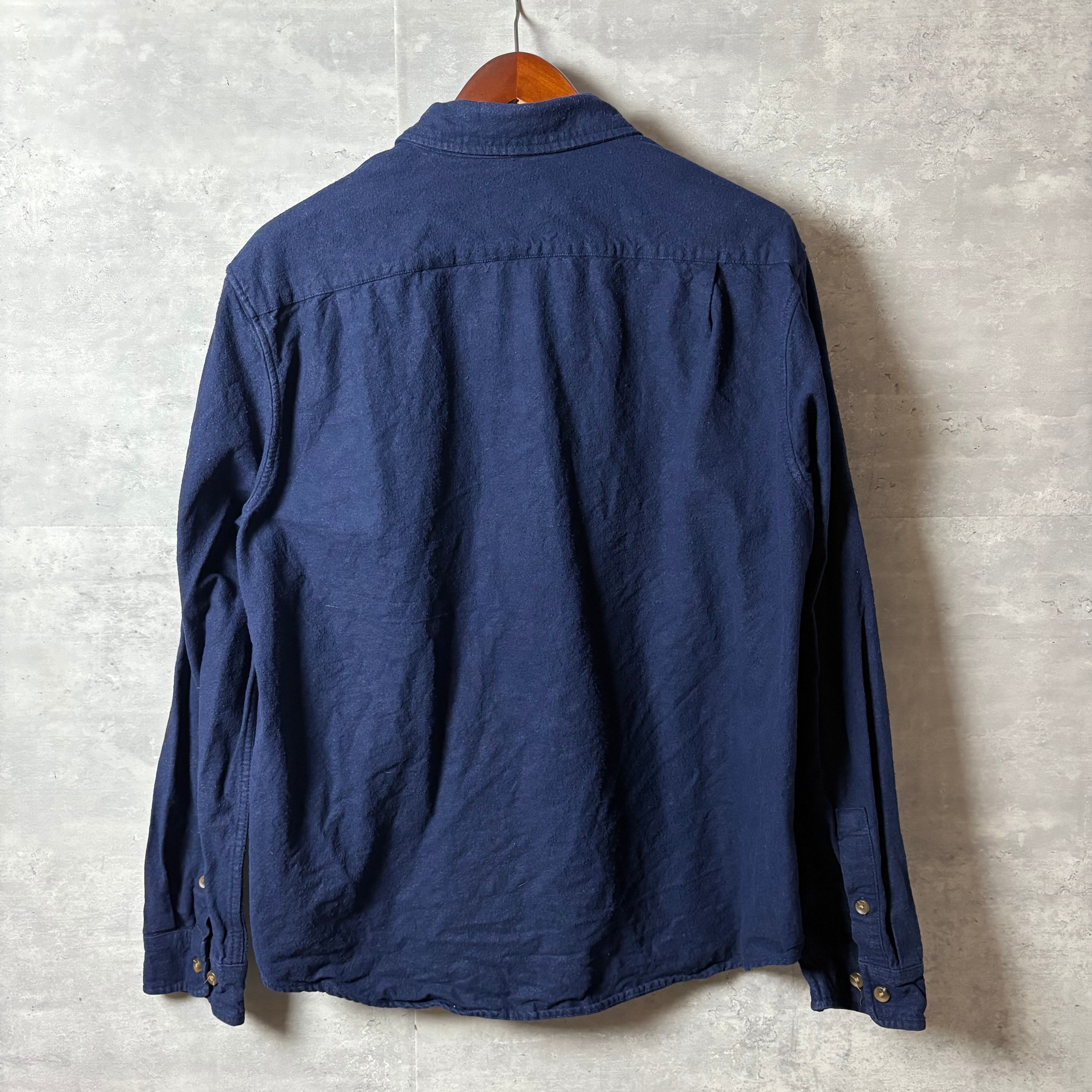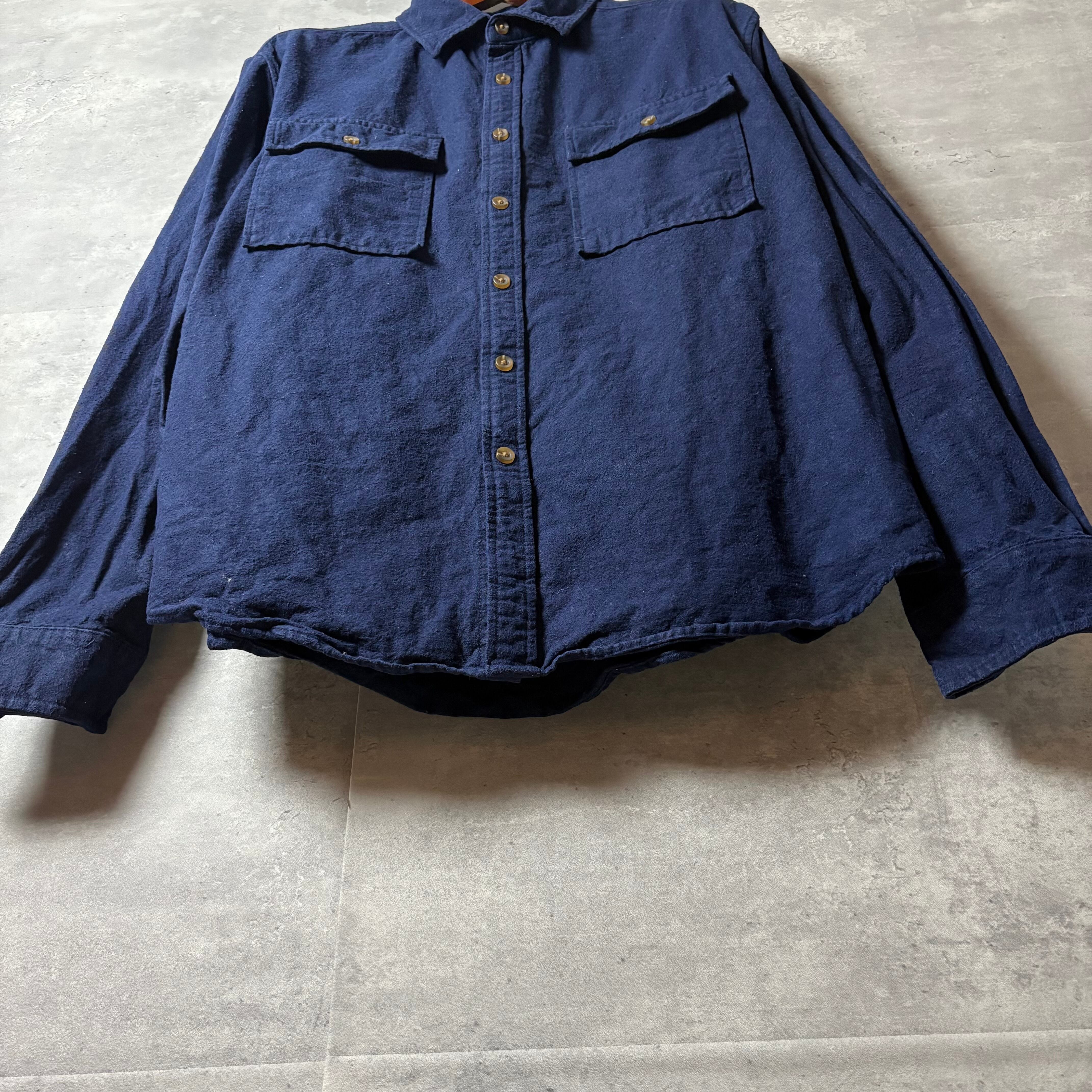無地ネイビーのシンプルなネルは着回し抜群。身幅65cmのXXL相当でゆったり羽織れるため、Tシャツやスウェットの上からオーバーシャツ感覚で活躍します。古着らしいフェードは味としてお楽しみください。気になる裾のアタリは簡易リペアでの再生も可能。タフなデイリーウェアをお探しの方に。