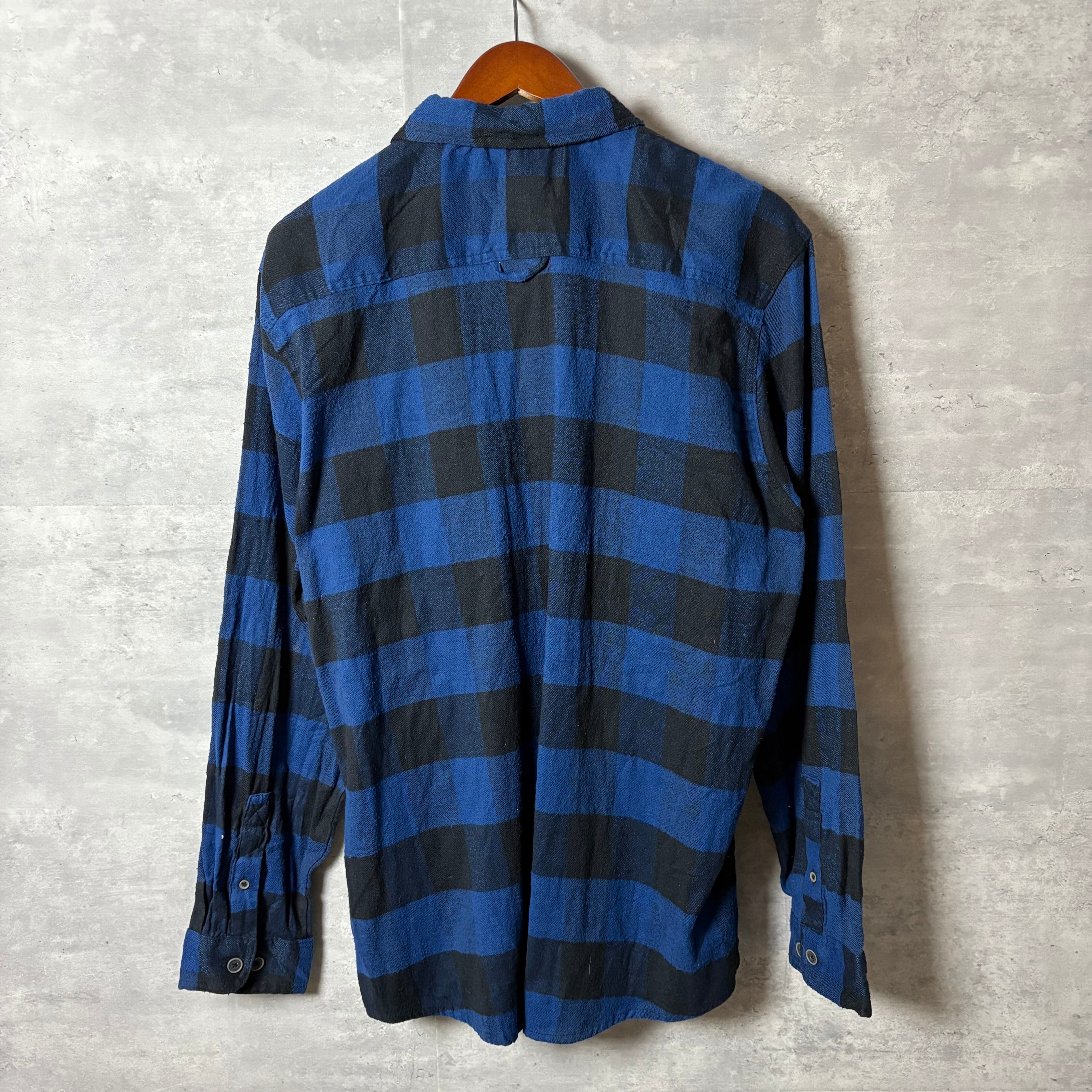 鮮やかなブルー×ブラックの大柄チェックが主役になる一着。Tシャツの上に羽織るだけでワーク感あるスタイルが完成します。ゆったり目のXLでリラックス感ある着心地。古着の風合いを楽しみたい方におすすめです。必要に応じて簡易リペアや補強で長くご着用ください。
