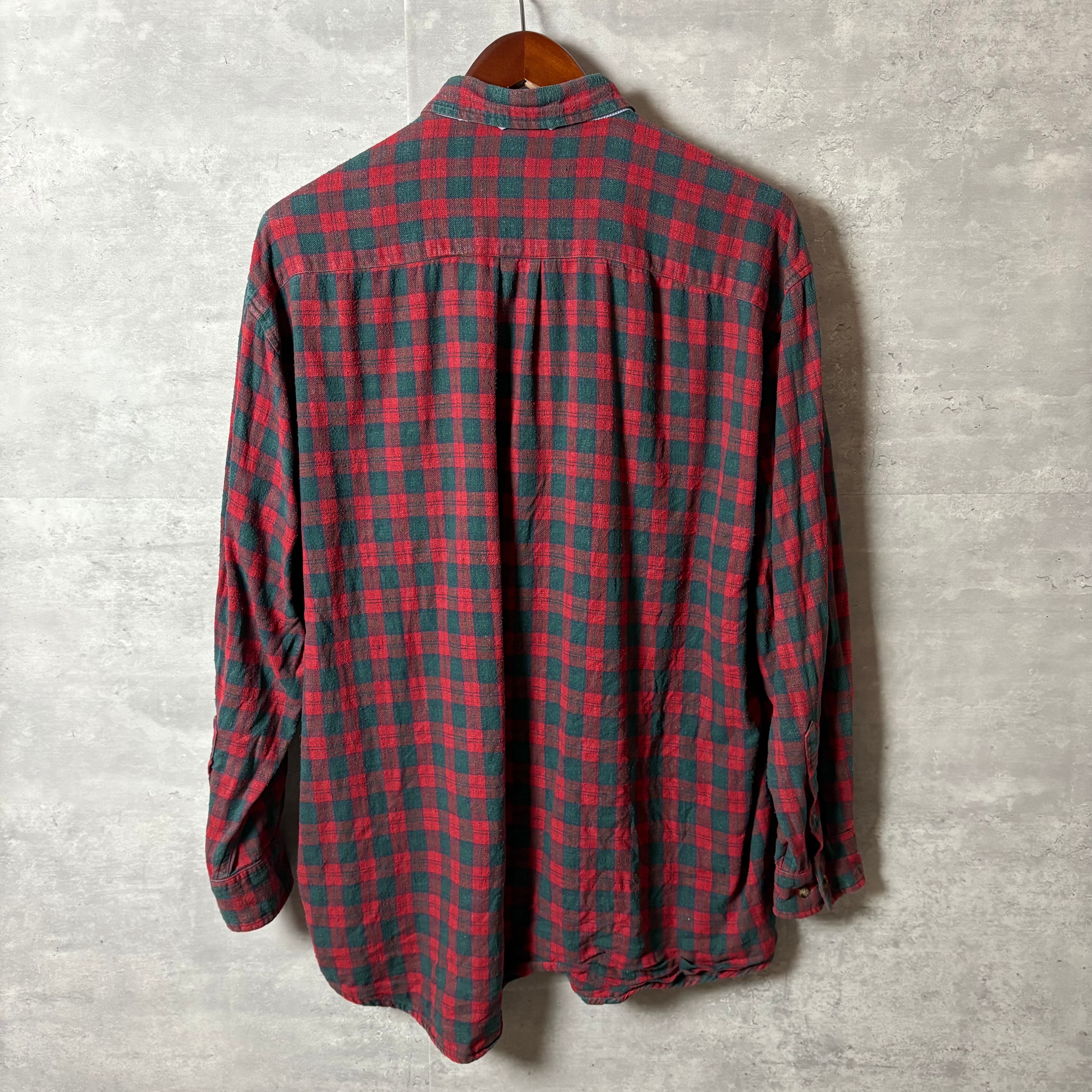 赤×緑の好配色チェックにボタンダウン仕様で、アメカジ・アイビースタイルに合わせやすい一枚です。Tシャツの上から羽織るだけで季節感のあるコーデが完成。古着ならではの色褪せやスレは味としてお楽しみください。気になる箇所はリペアやリステッチで再生する楽しみもあり、ヴィンテージの雰囲気が好きな方におすすめです。