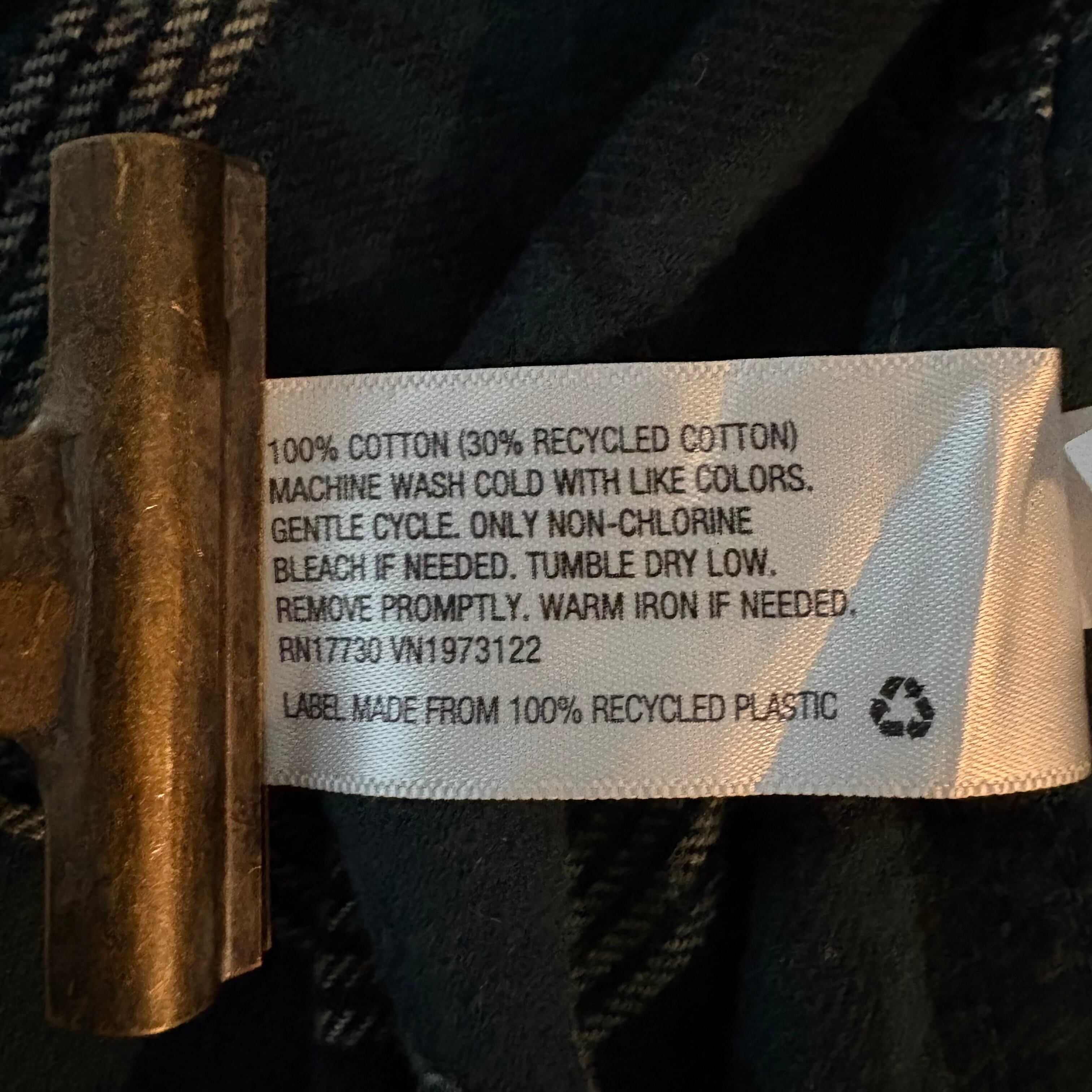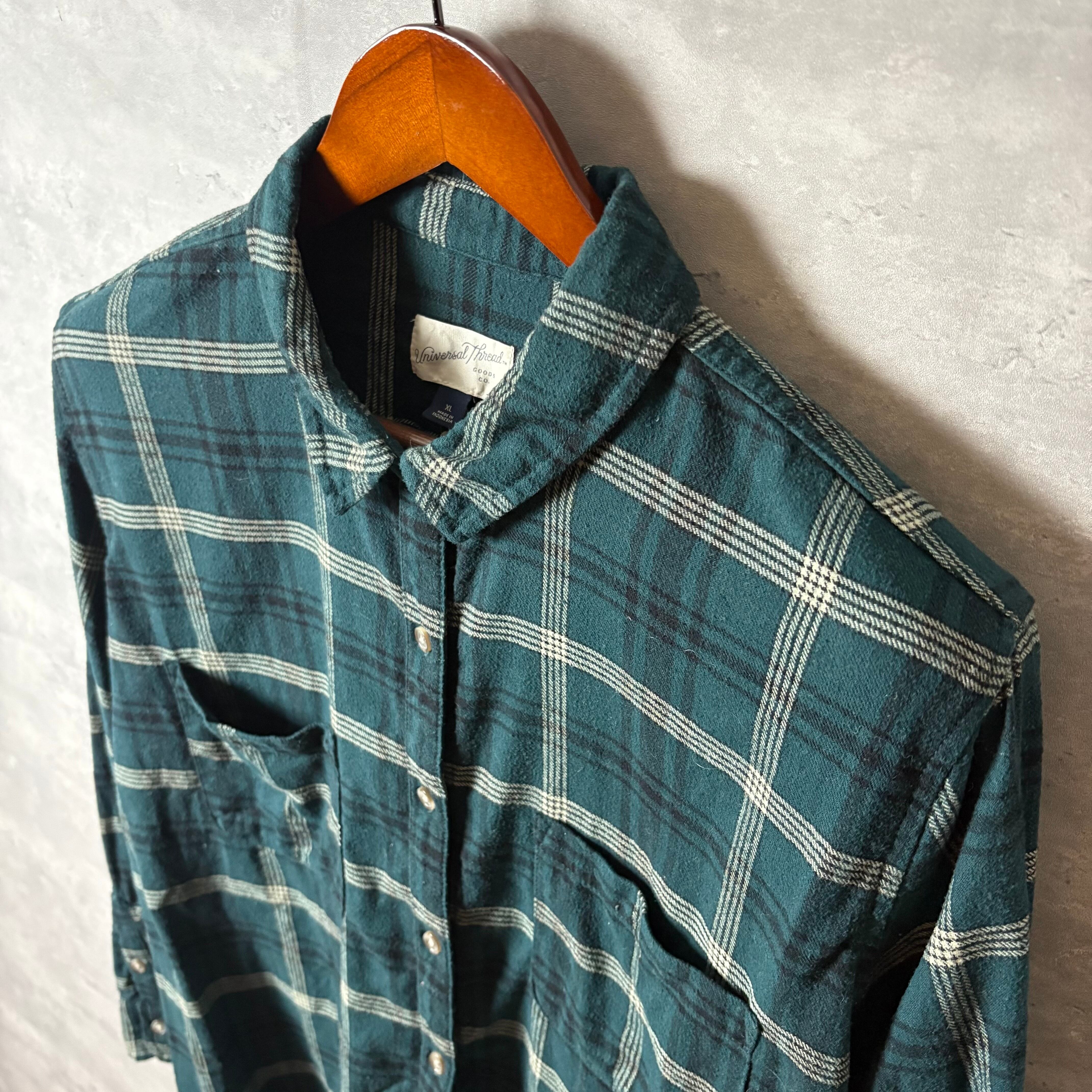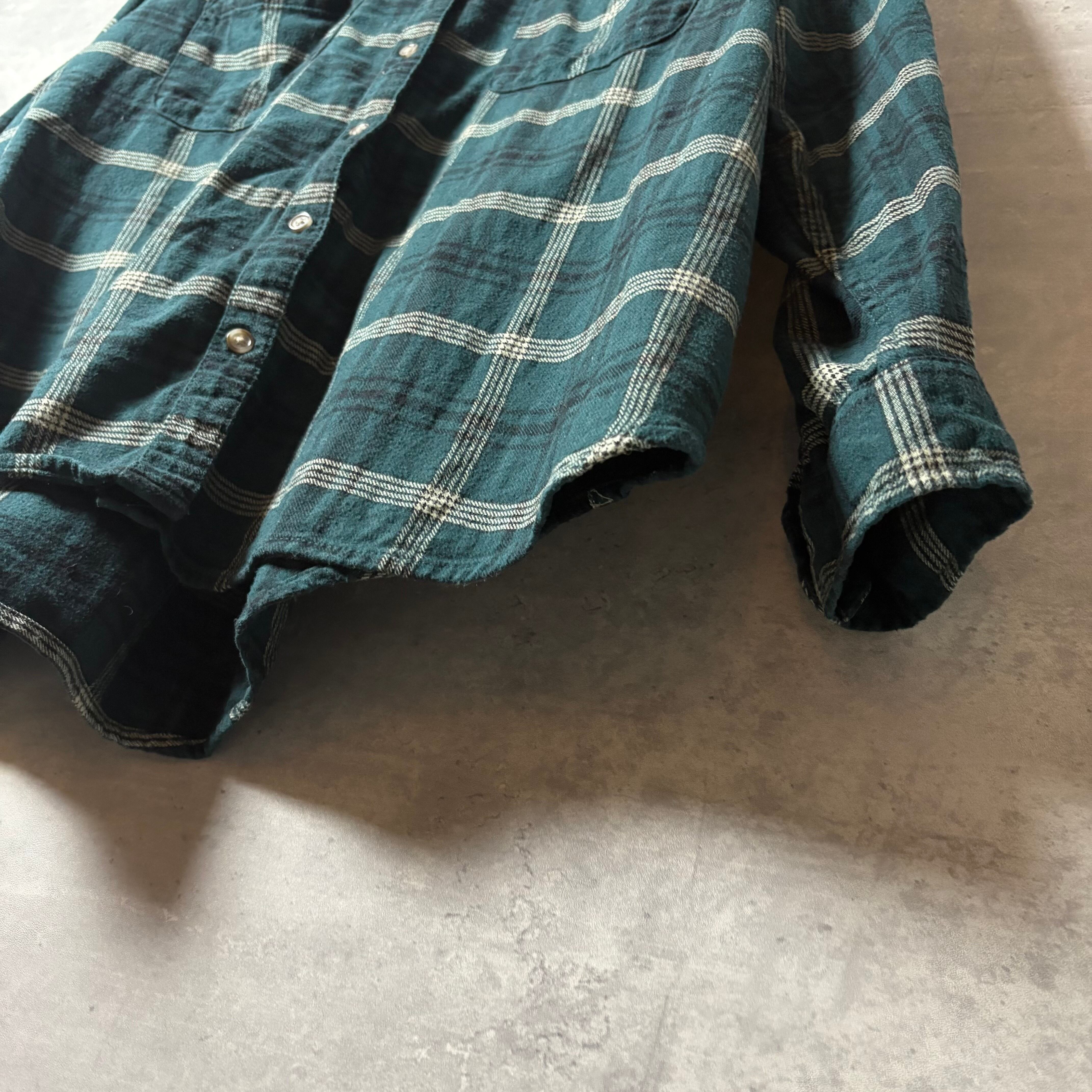 深緑ベースの落ち着いたチェックで合わせやすい一枚。柔らかなフランネルで着心地が良く、デニムやチノ、黒パンツまで幅広くマッチします。実寸はゆとりがあるため、オーバーサイズでの着こなしやメンズ着用にも対応。古着ならではの風合いは味としてお楽しみください。気になる箇所は簡単な補修で長くご着用いただけます。