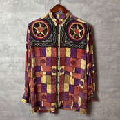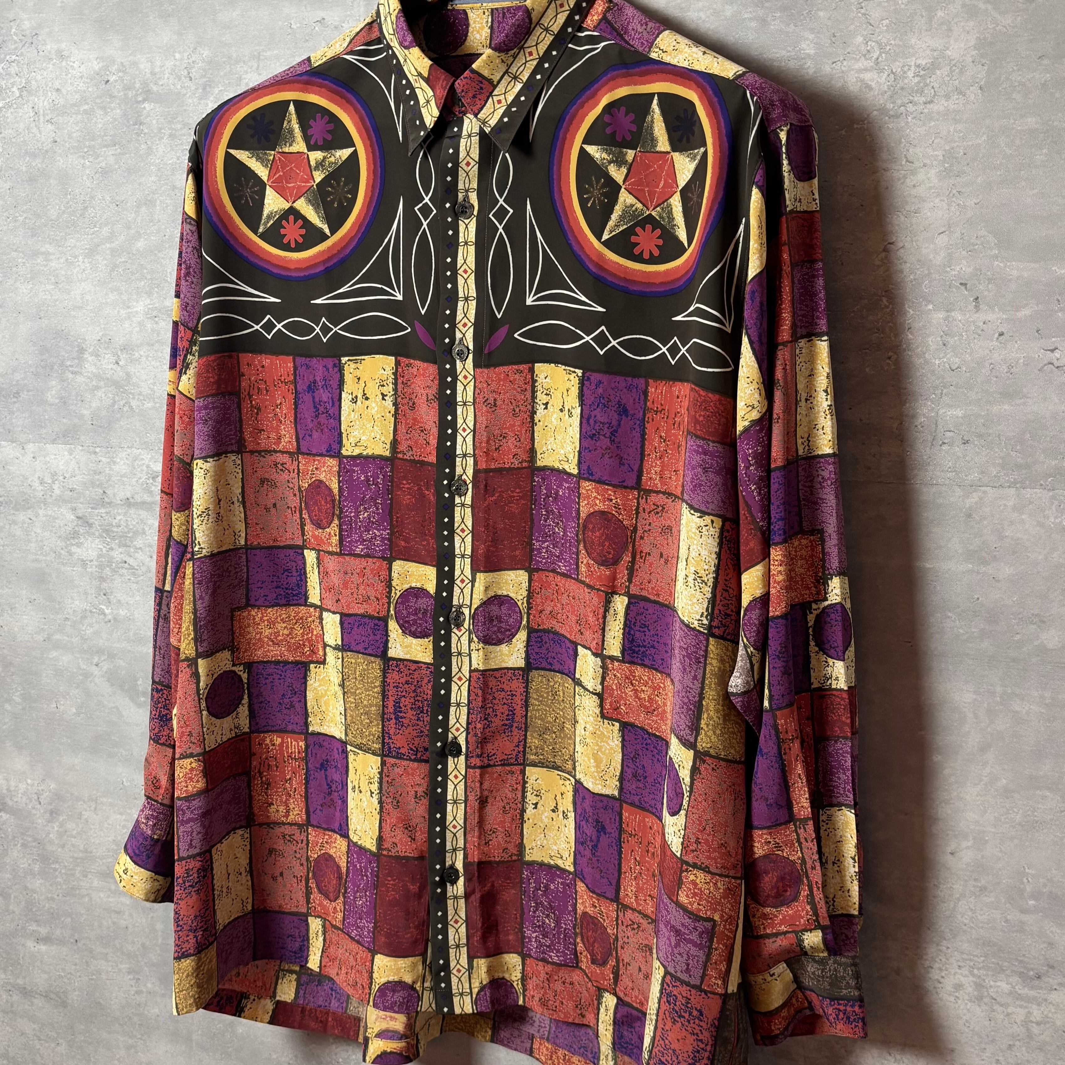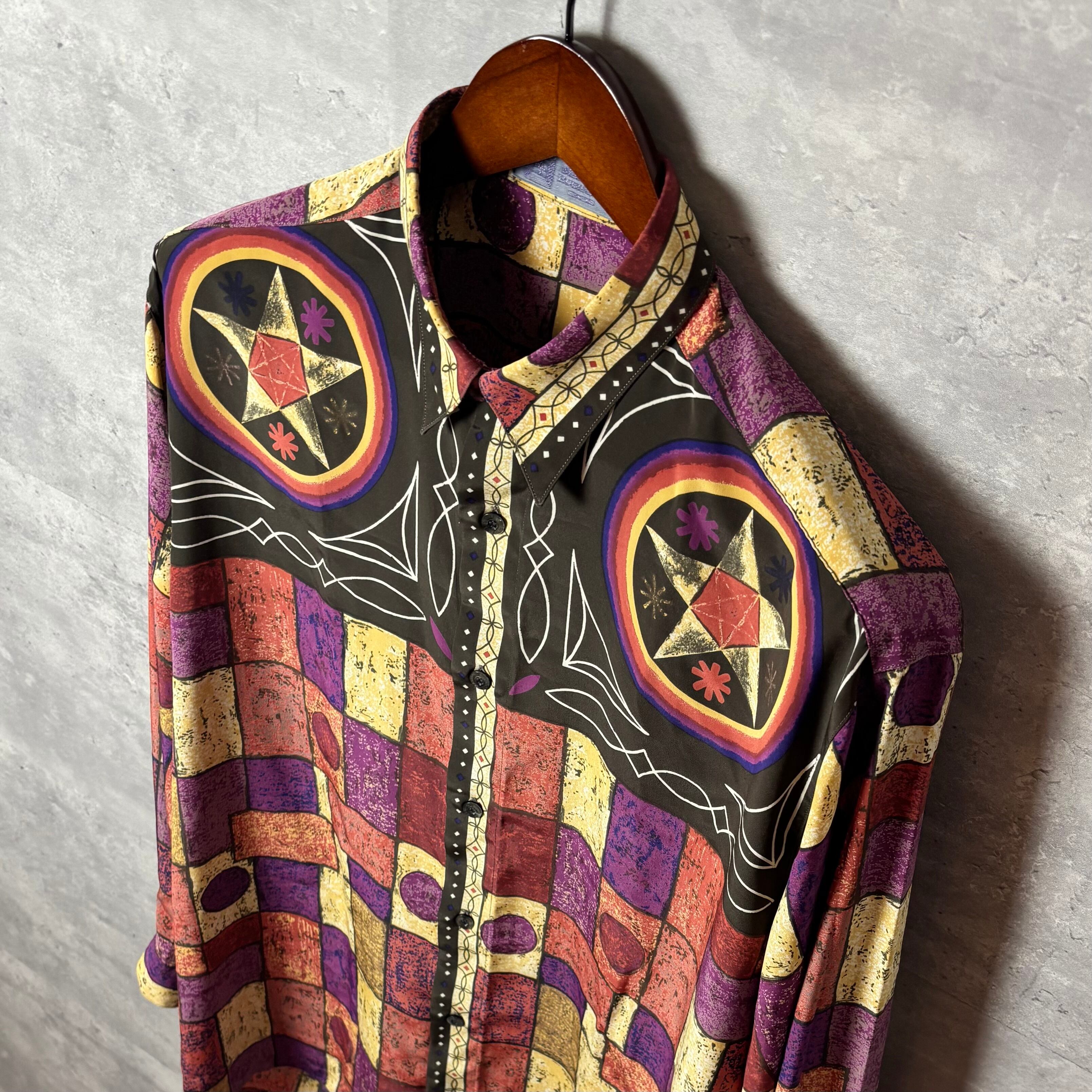 90年代テイスト漂うMariano Rubinacciのビンテージシャツ。芸術的な幾何学柄とサイケデリックな色合いが抜群の存在感を放ちます。シンプルなボトムスと合わせるだけで個性を演出でき、古着コーデの主役になる一枚。ユニセックスで着用可能です。