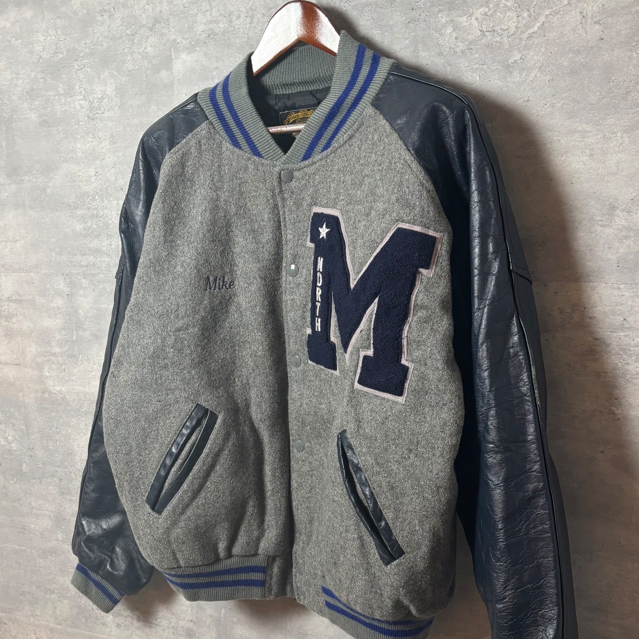 - 【特徴】: フロントに大きなMワッペンと「NORTH」刺繍、ネーム刺繍「Mike」、本革スリーブ、裏地キルティング仕様