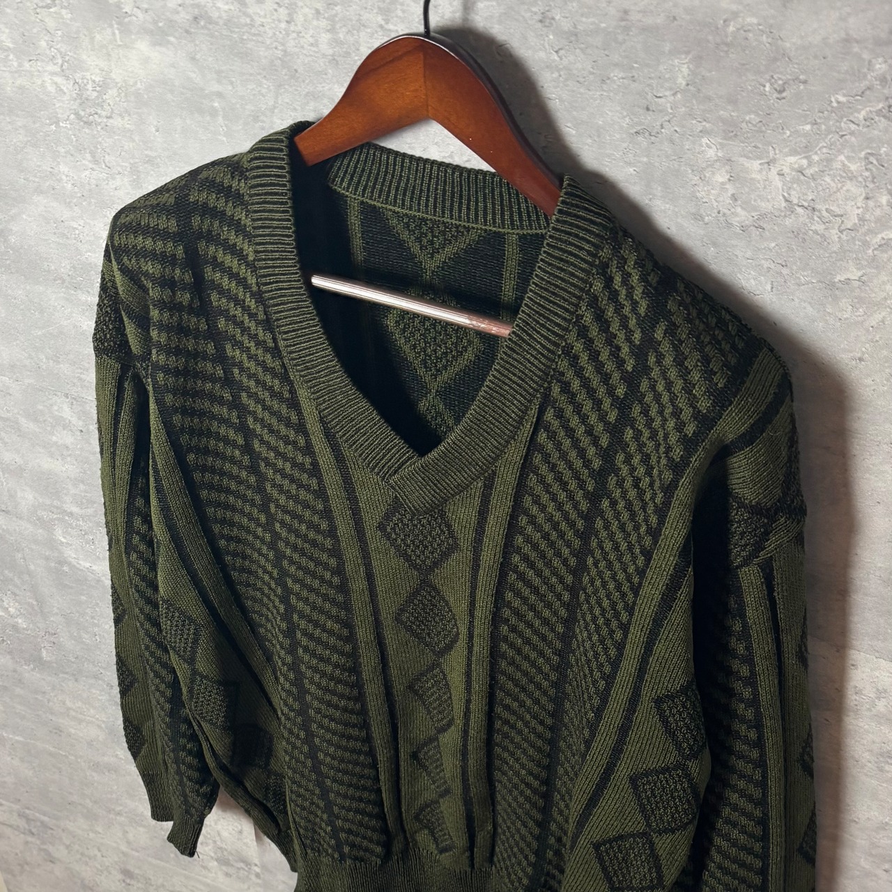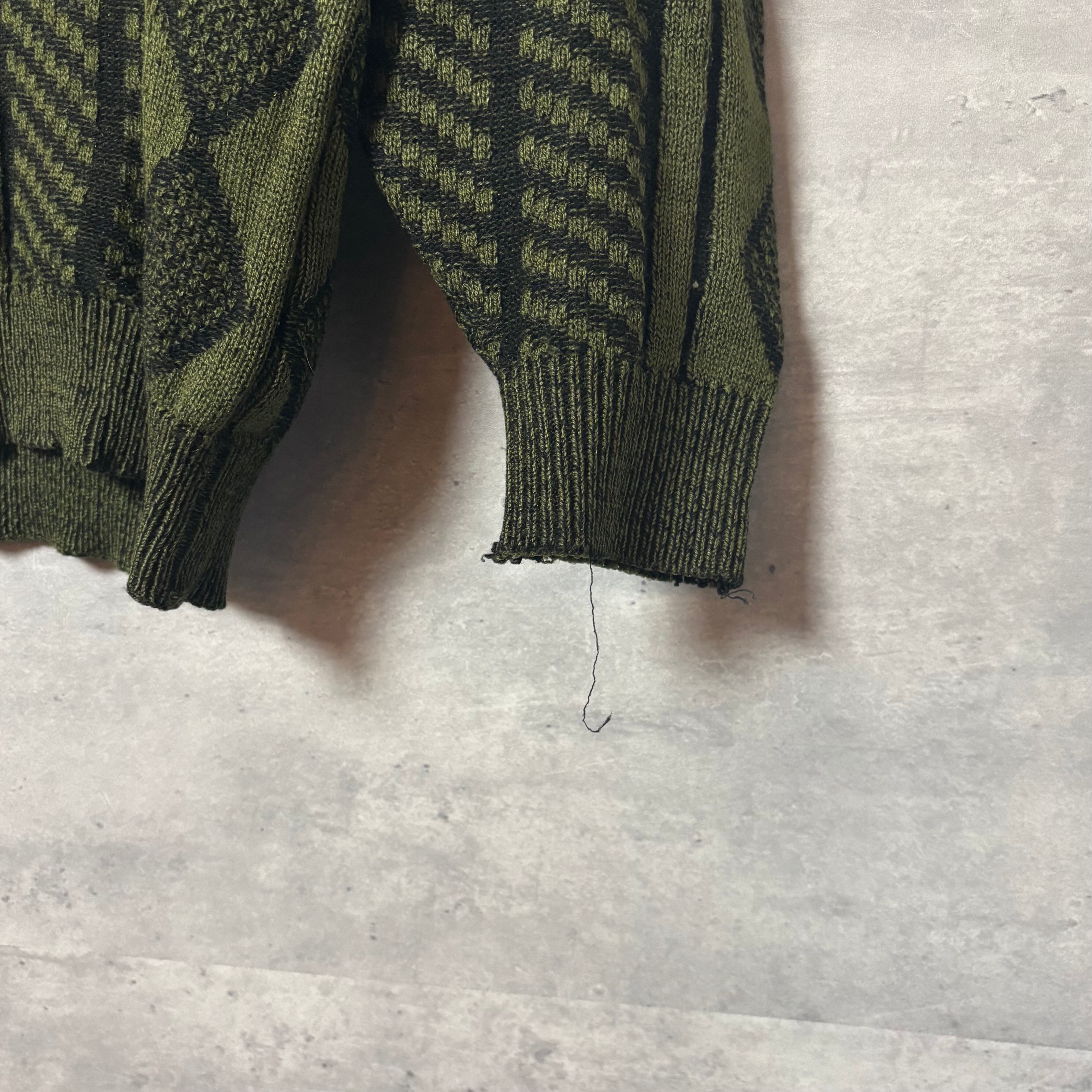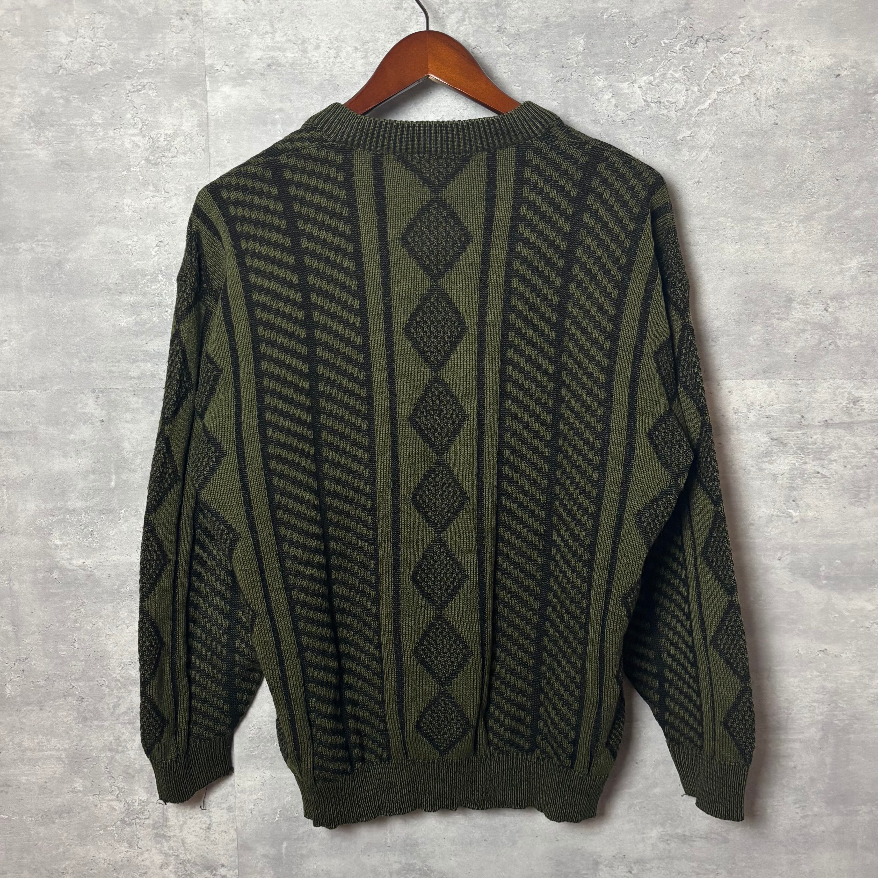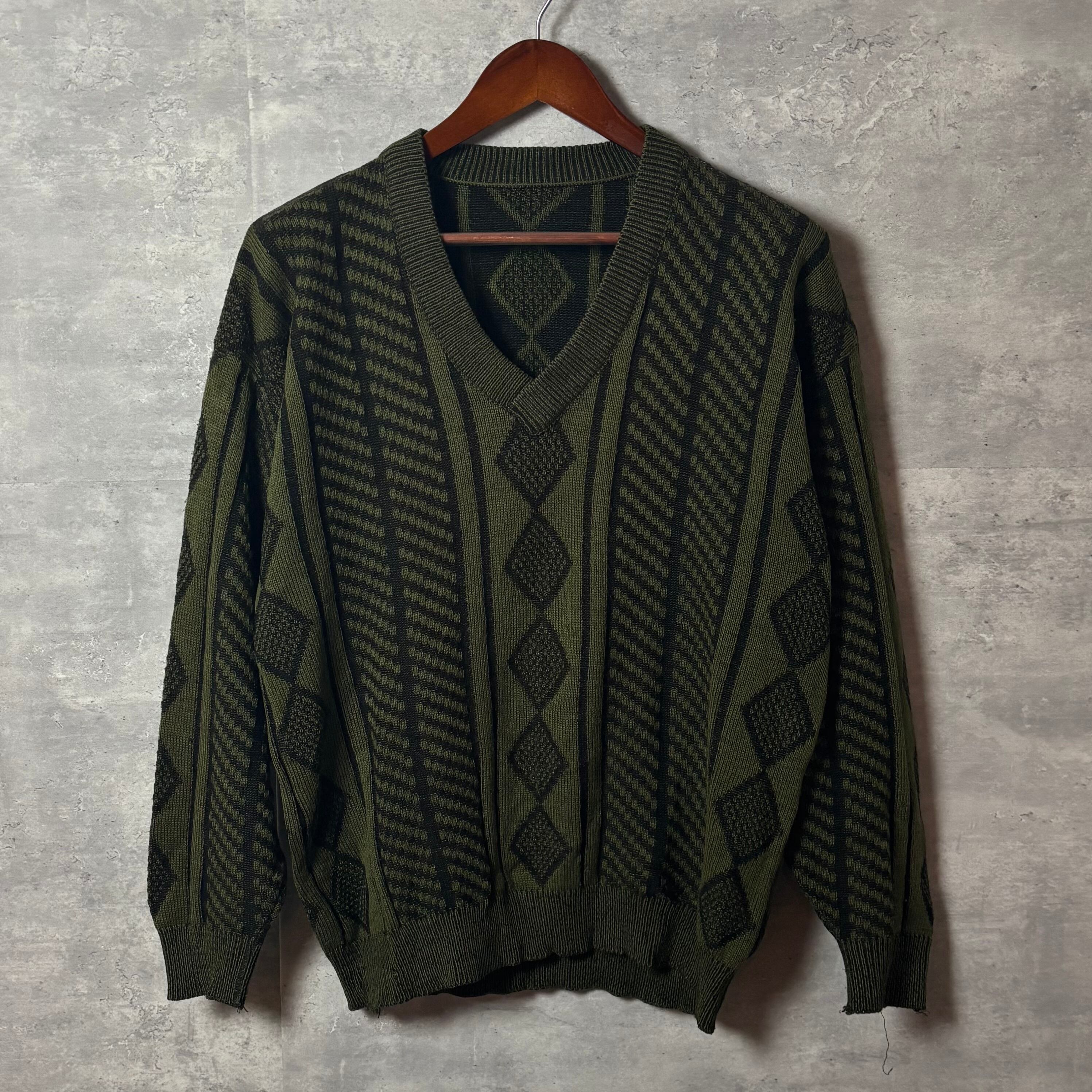 ヴィンテージ, 90s, Vネックニット, 幾何学模様, レトロファッション, セージグリーン, アメカジ, オーバーサイズ