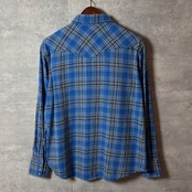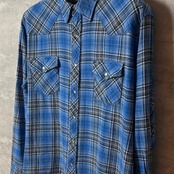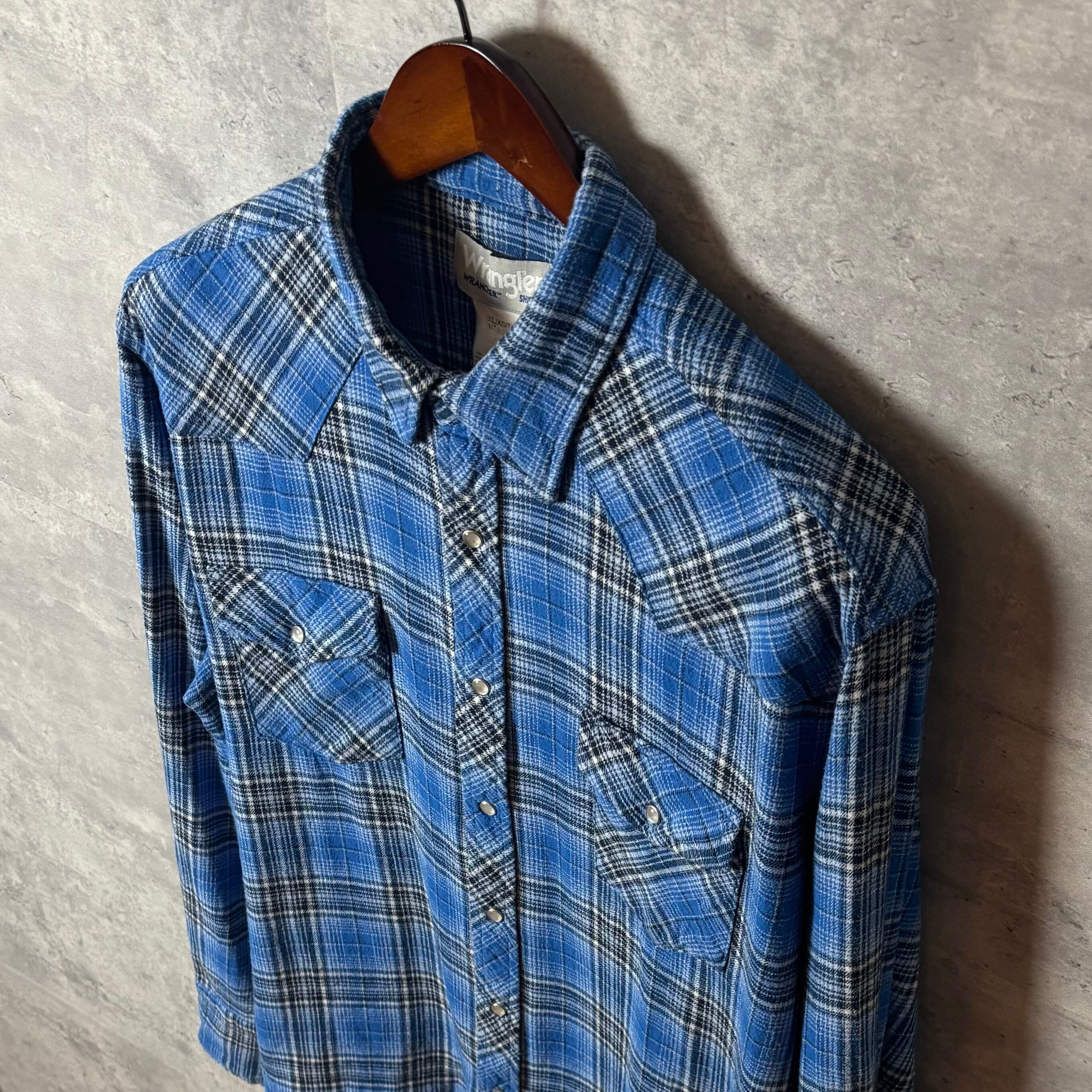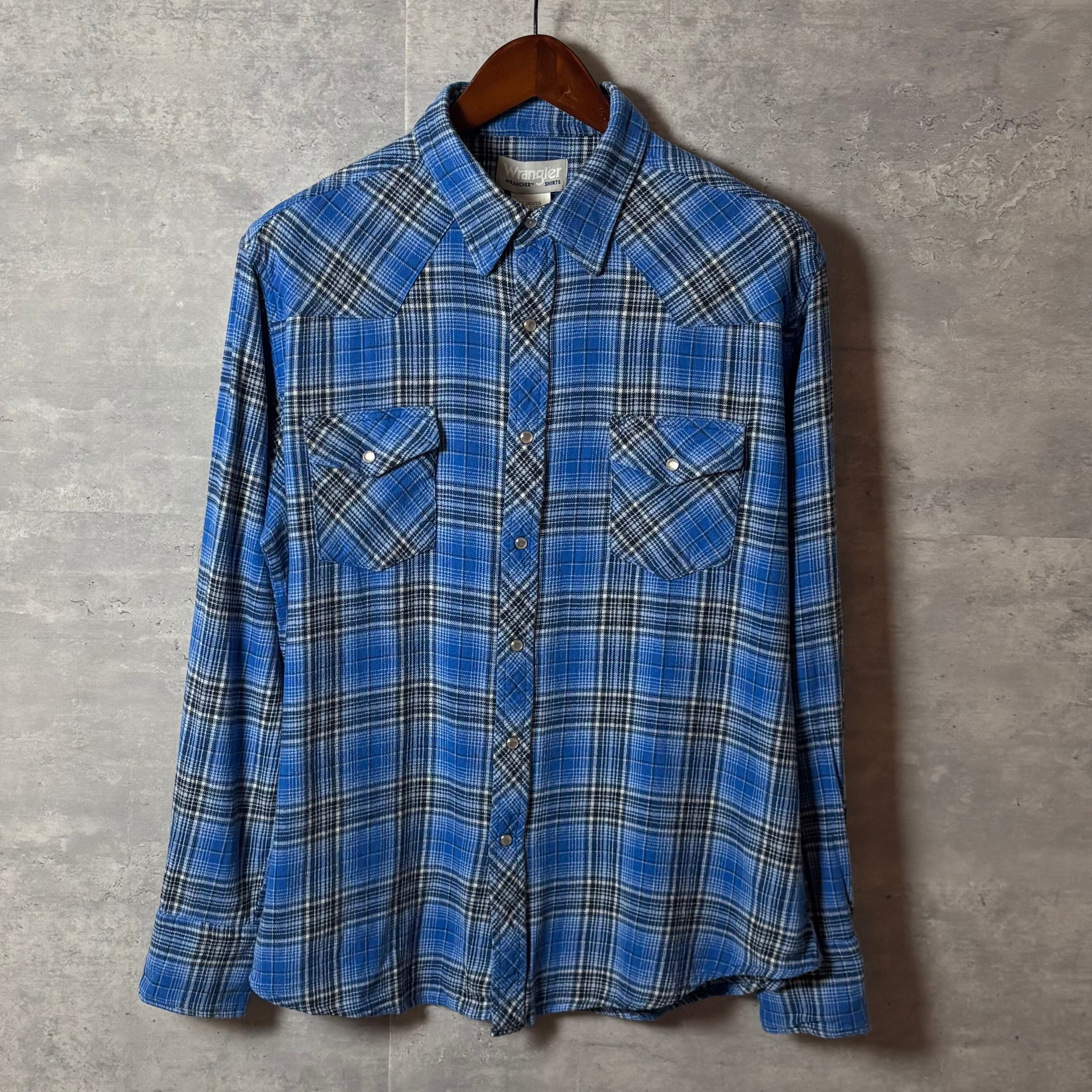 Wranglerのクラシックなウエスタンシャツです。鮮やかなブルーチェック柄が特徴で、秋冬コーデの差し色にぴったり。柔らかいネル素材で着心地も良好。デニムやチノパンと合わせたカジュアルスタイルにおすすめです!