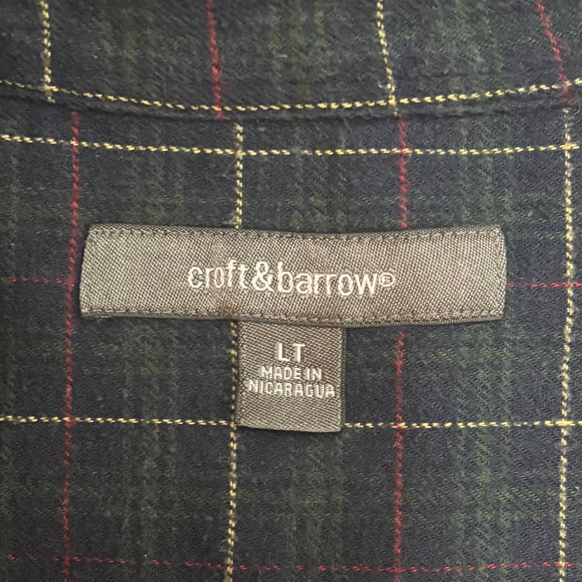 Croft & Barrowの長袖フランネルシャツ。ダークグリーンを基調に、赤と白のチェック柄がアクセントになった温かみのあるデザインです。ボタンダウン仕様で、カジュアルからトラッドスタイルまで幅広く着こなせます。LT(L-トールサイズ)のため丈が長めで、スッキリしたシルエットを演出。秋冬のレイヤードスタイルにもおすすめの一着です。