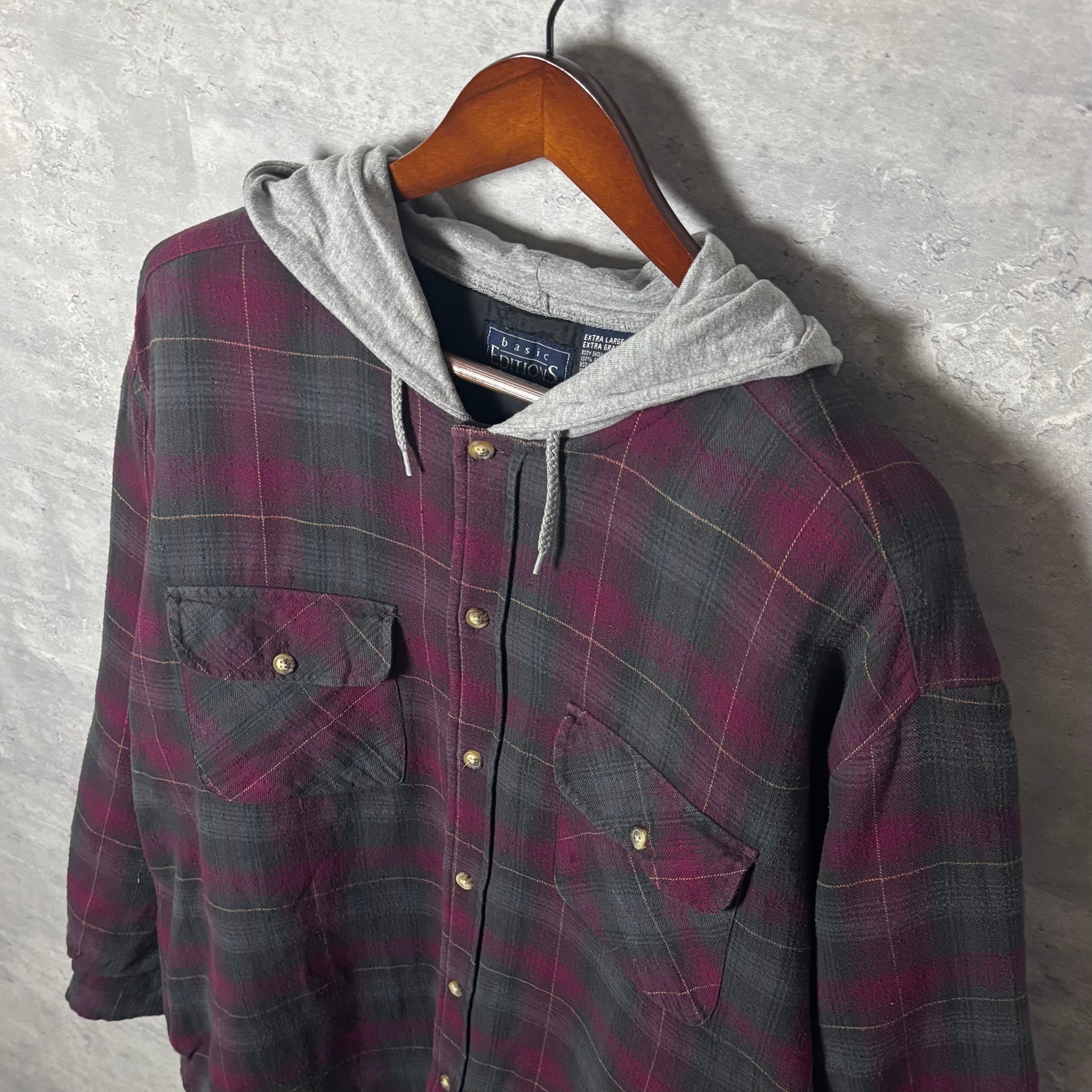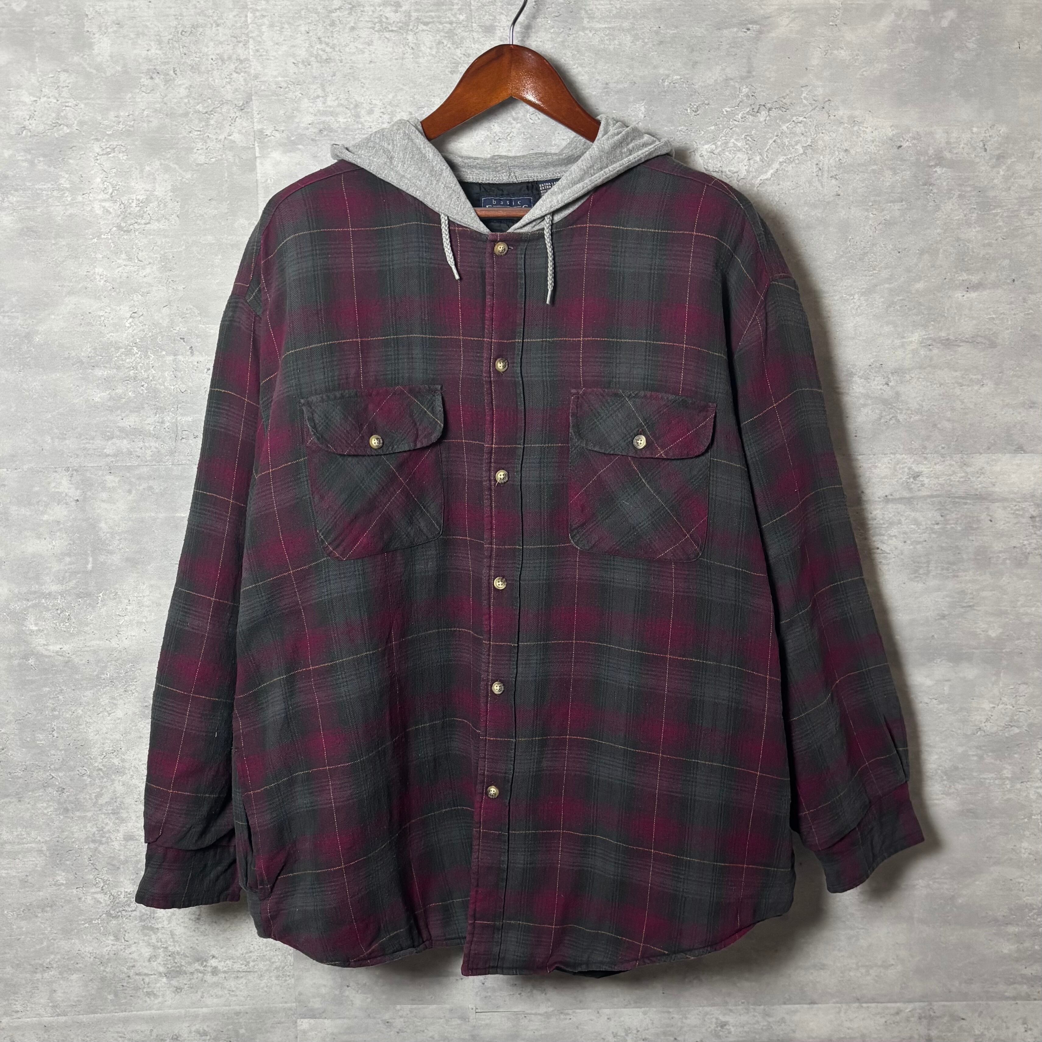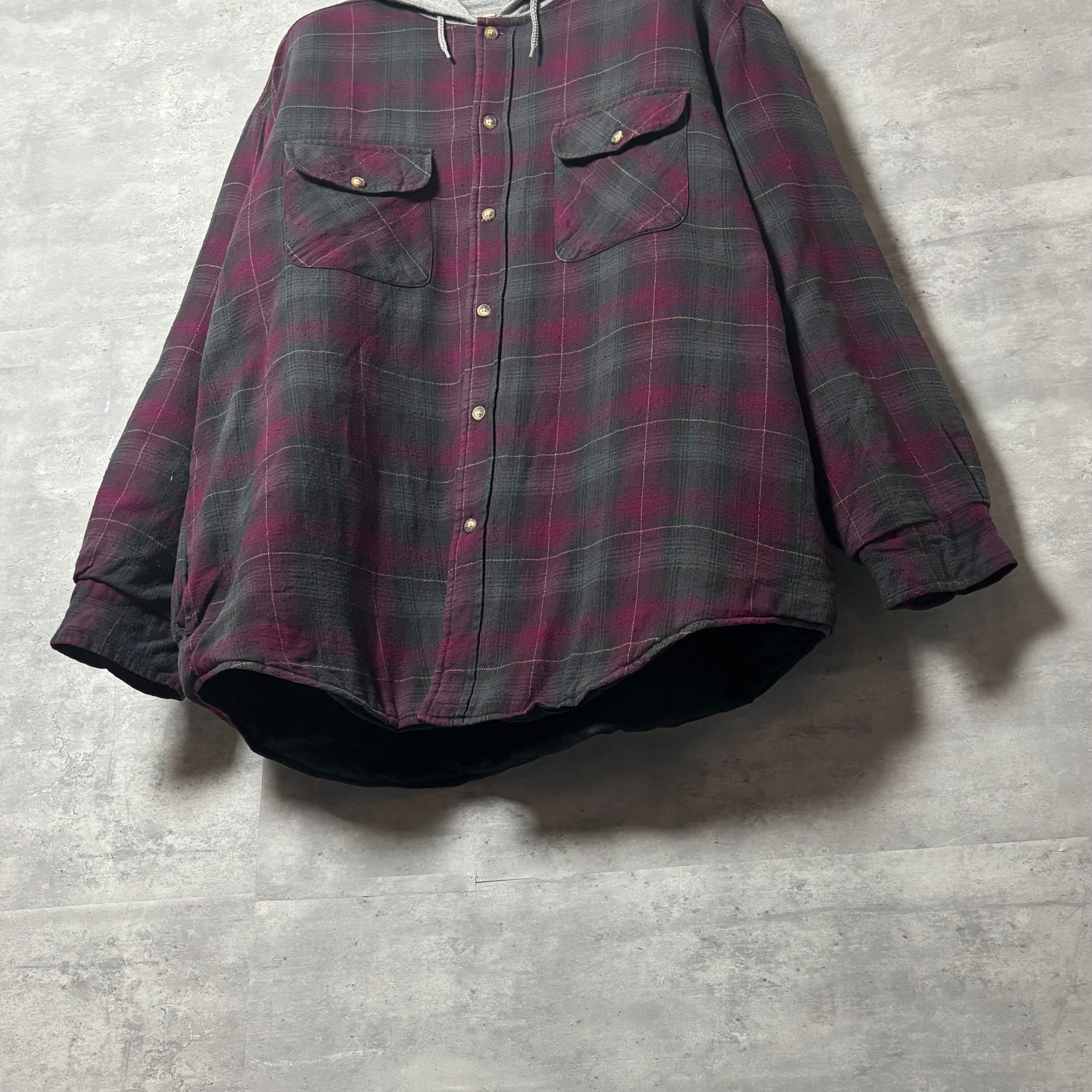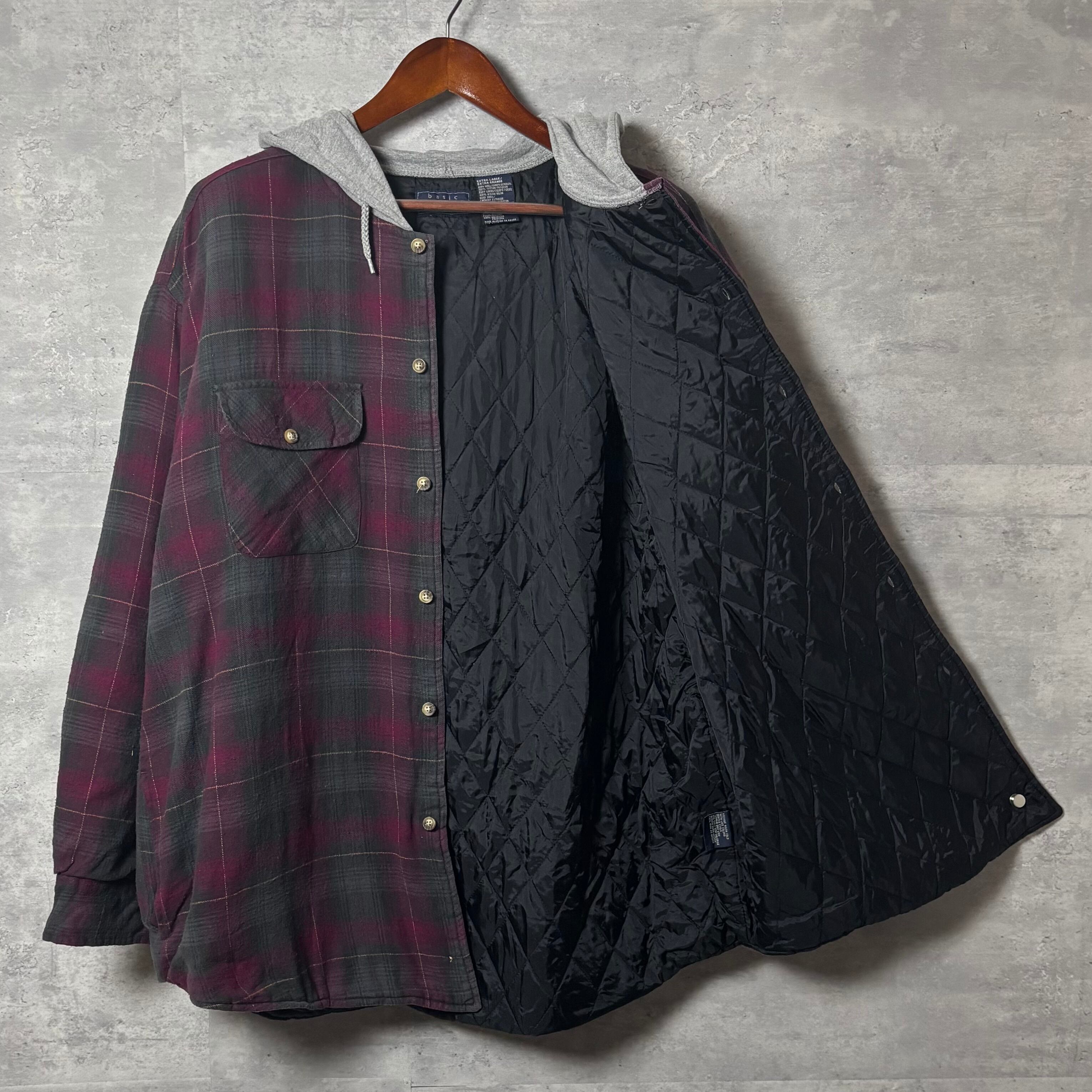 アメリカ古着らしいbasic EDITIONSのフード付きチェックシャツジャケット。裏地はキルティング仕様で中綿入りのため防寒性も高く、ライトアウター感覚で着用いただけます。ストリート・古着コーデ・スケーター系など幅広いスタイルに活躍する一着です。