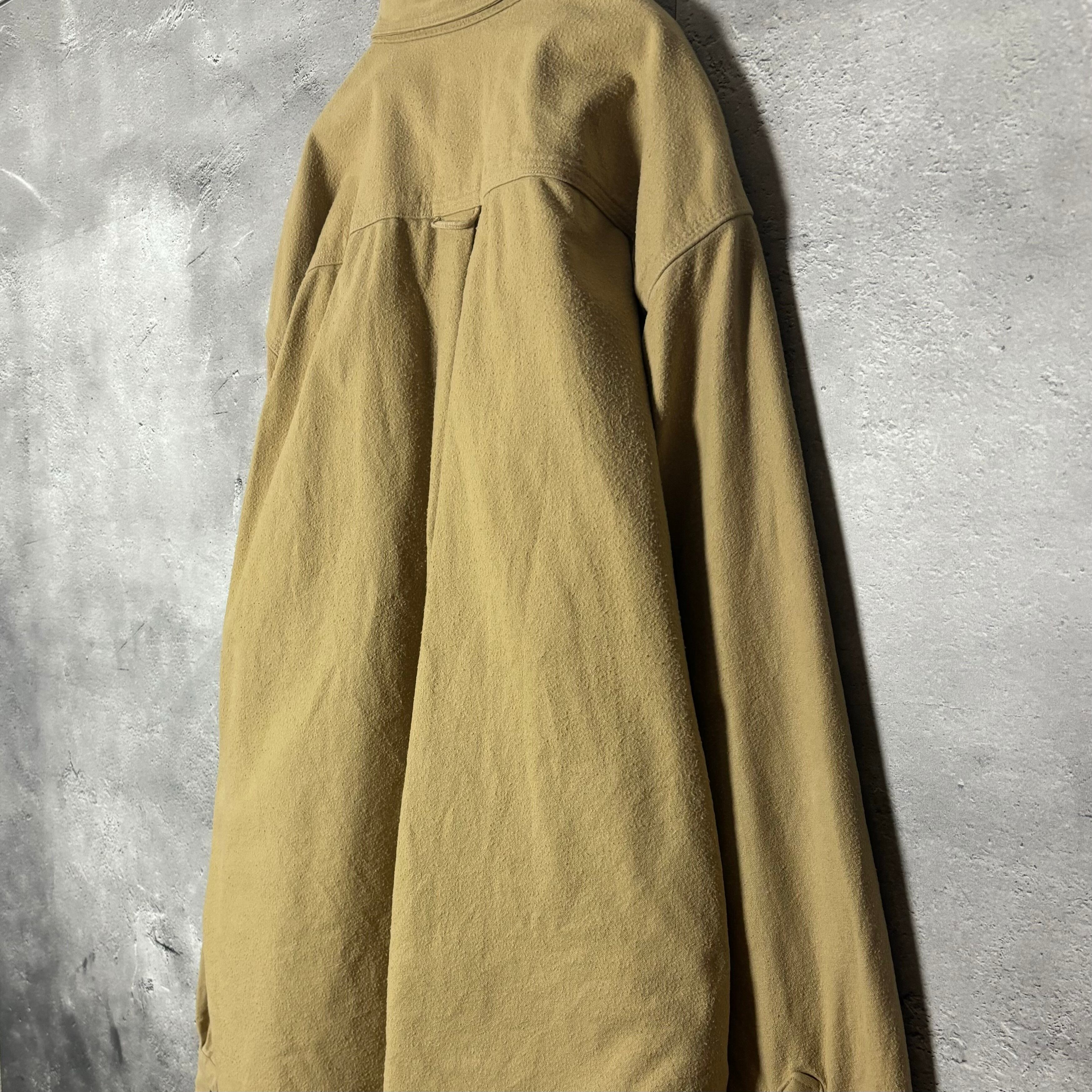 - [特徴]: USA製のヴィンテージアイテム。厚手で起毛されたコットン素材が特徴で、秋冬シーズンにぴったりの一枚です。ゆったりとしたシルエットとベージュの色味がコーディネートしやすく、アウトドアからタウンユースまで幅広く活用可能です。両サイドにスリットを採用したデザインもポイントです。