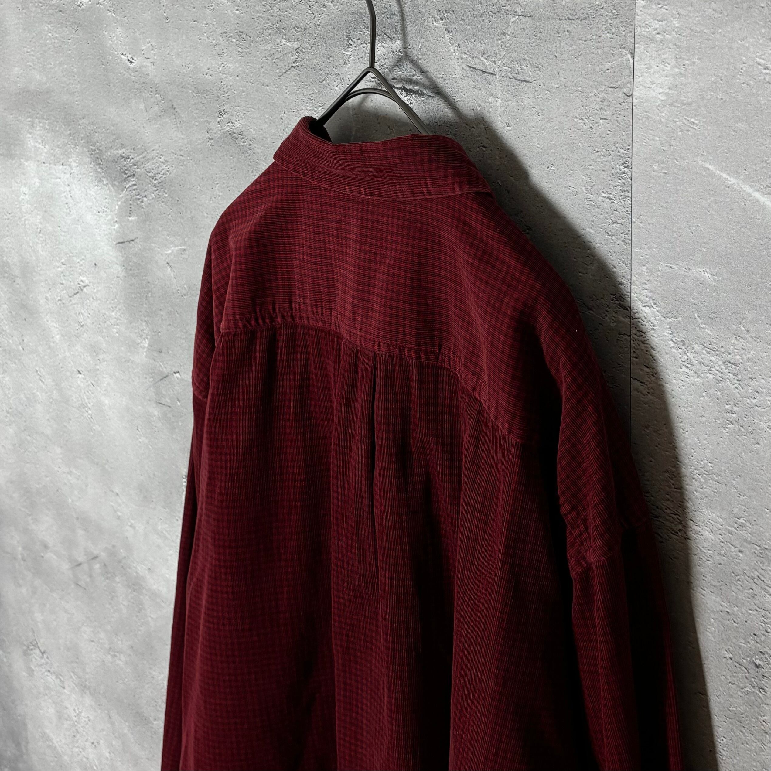 OLD NAVYのコーデュロイシャツです。細かいチェック柄と落ち着いた赤色が特徴で、大人のカジュアルスタイルにぴったり。コーデュロイの柔らかい風合いがあり、秋冬シーズンに最適なアイテムです。オーバーサイズ気味なので、ゆったりと着こなせる一着です。