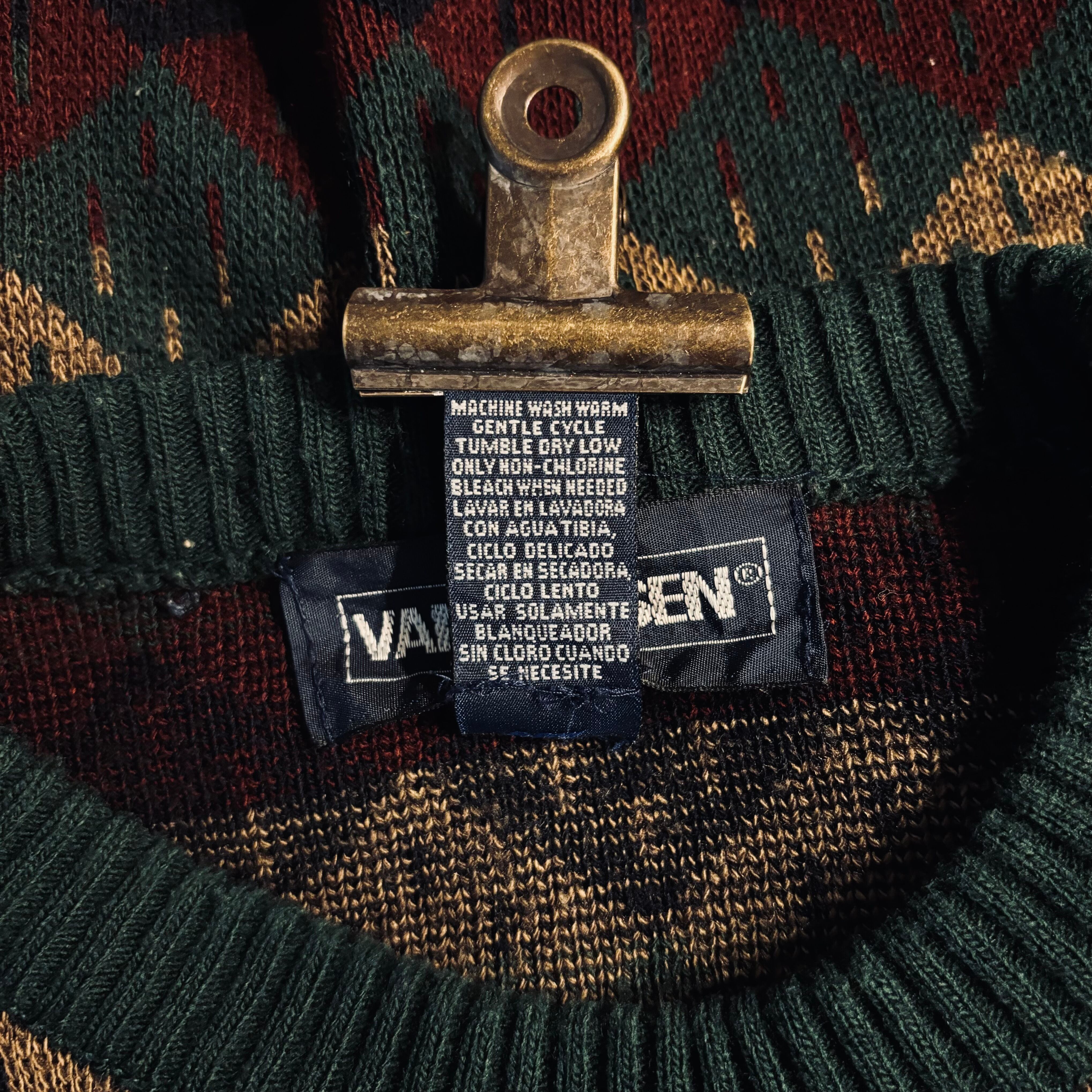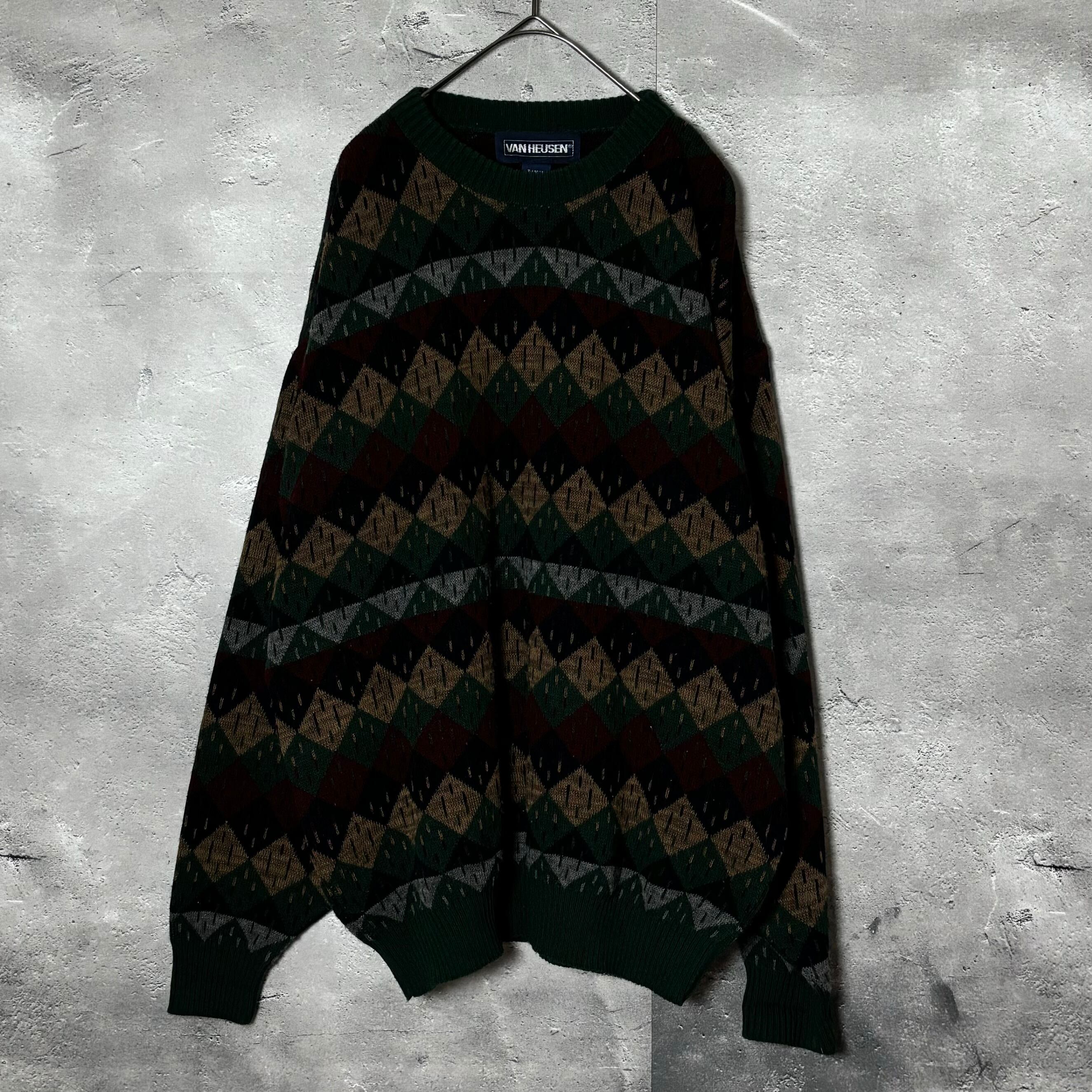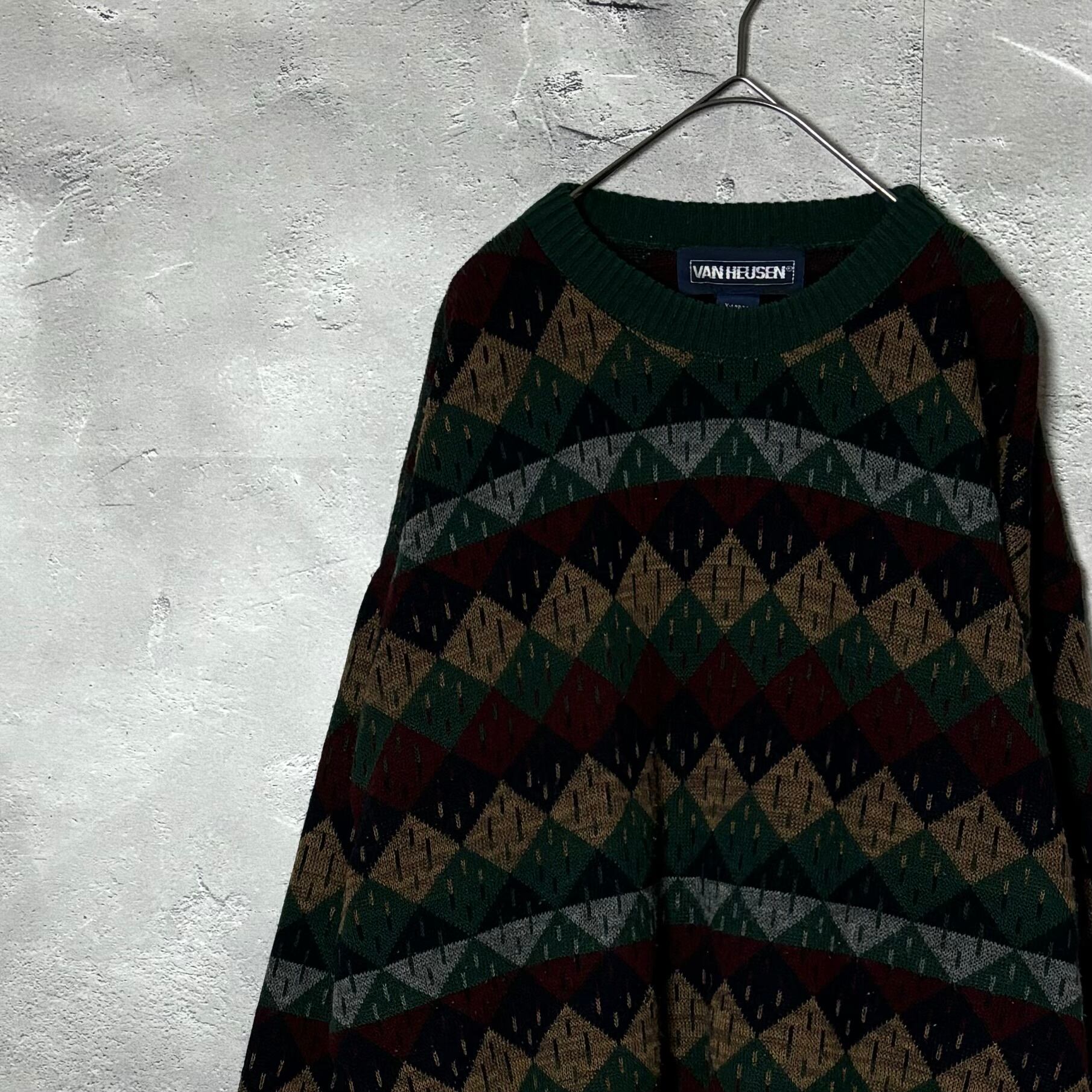 VAN HEUSEN, アーガイル柄, クルーネックニット, セーター, グリーン, 秋冬コーデ, 古着, ユーズド, ゆったりシルエット, クラシック