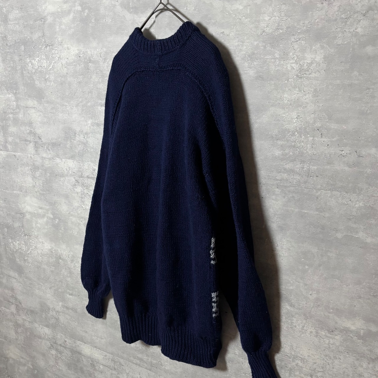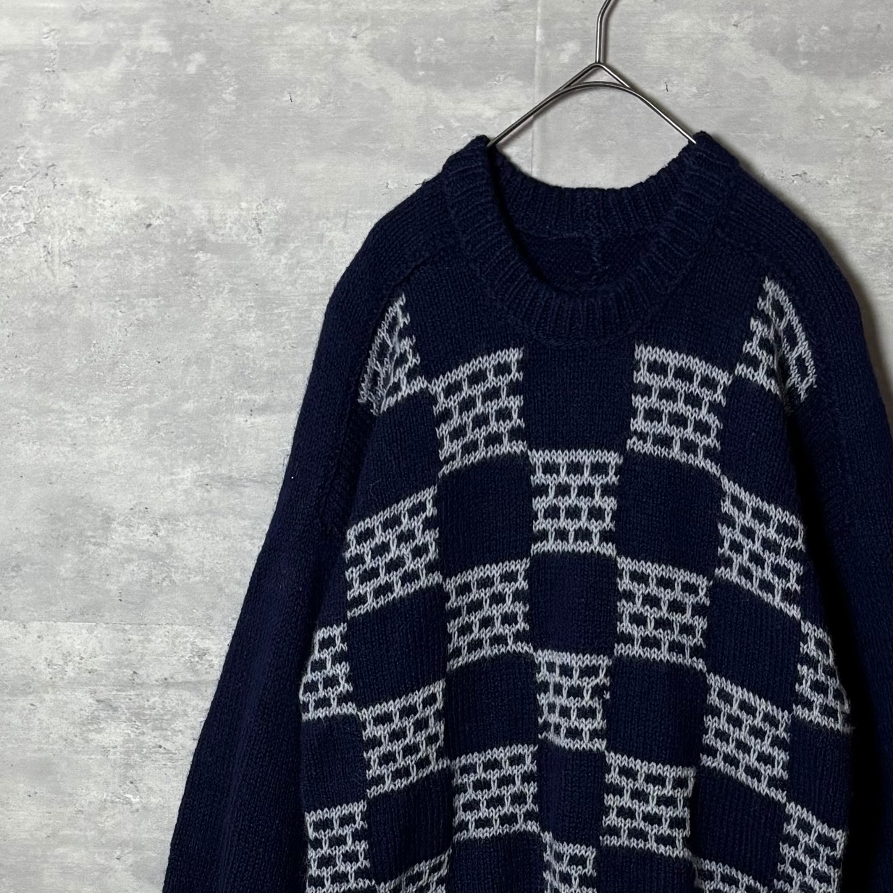 80s ヴィンテージ チェック柄ニットセーター ネイビー L